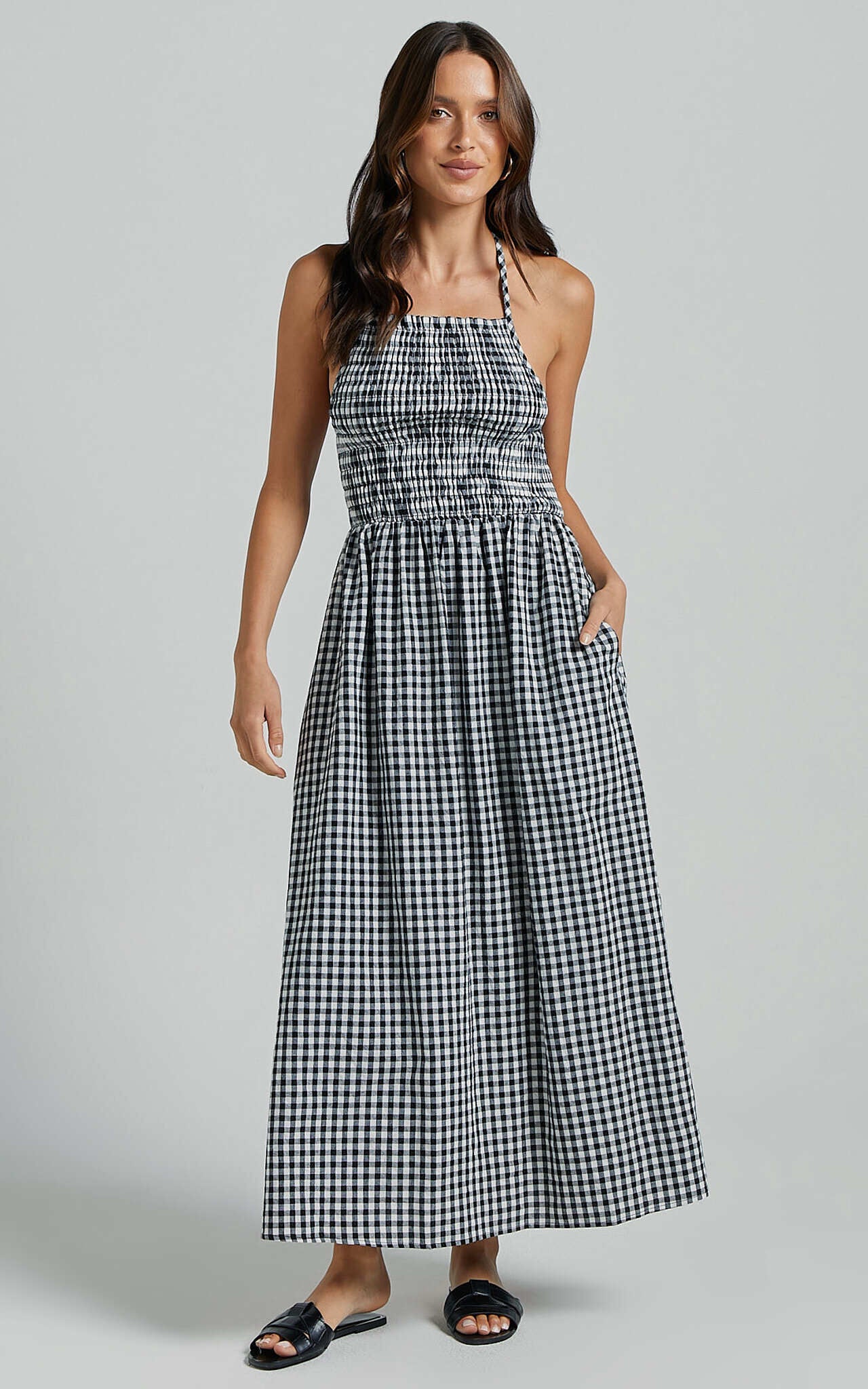 Get ready to turn heads in the Aimie Midi Dress! This stunning white check dress features a strappy halter neck and shirred top, giving it an effortlessly chic and feminine look. Made from 100% cotton, this dress is not only comfortable but also perfect for those hot summer days. The shift dress style flatters all body types, while the midi length adds a touch of sophistication. With its sleeveless design and casual vibe, the Aimie Midi Dress is versatile enough to wear on any occasion - whether you're going out with friends or attending a special event. Step out in confidence and style with this must-have addition to your wardrobe!Product Details:Shift dress styleMade from 100% cotton fabricHigh neckline designSleeveless for a chic lookMidi length for a versatile wearPerfect for casual occasionsSize and FitSize S / 8 length: 118cm / 46.46inMaterial and Care100% CottonLow / No stretchThe main fabric of this product is made from 100% Natural Fibres, Whilst some of these fibres still have detrimental impacts in thier supply chain, Natural Fibres have a reduced overall impact compared to a raw polyester.