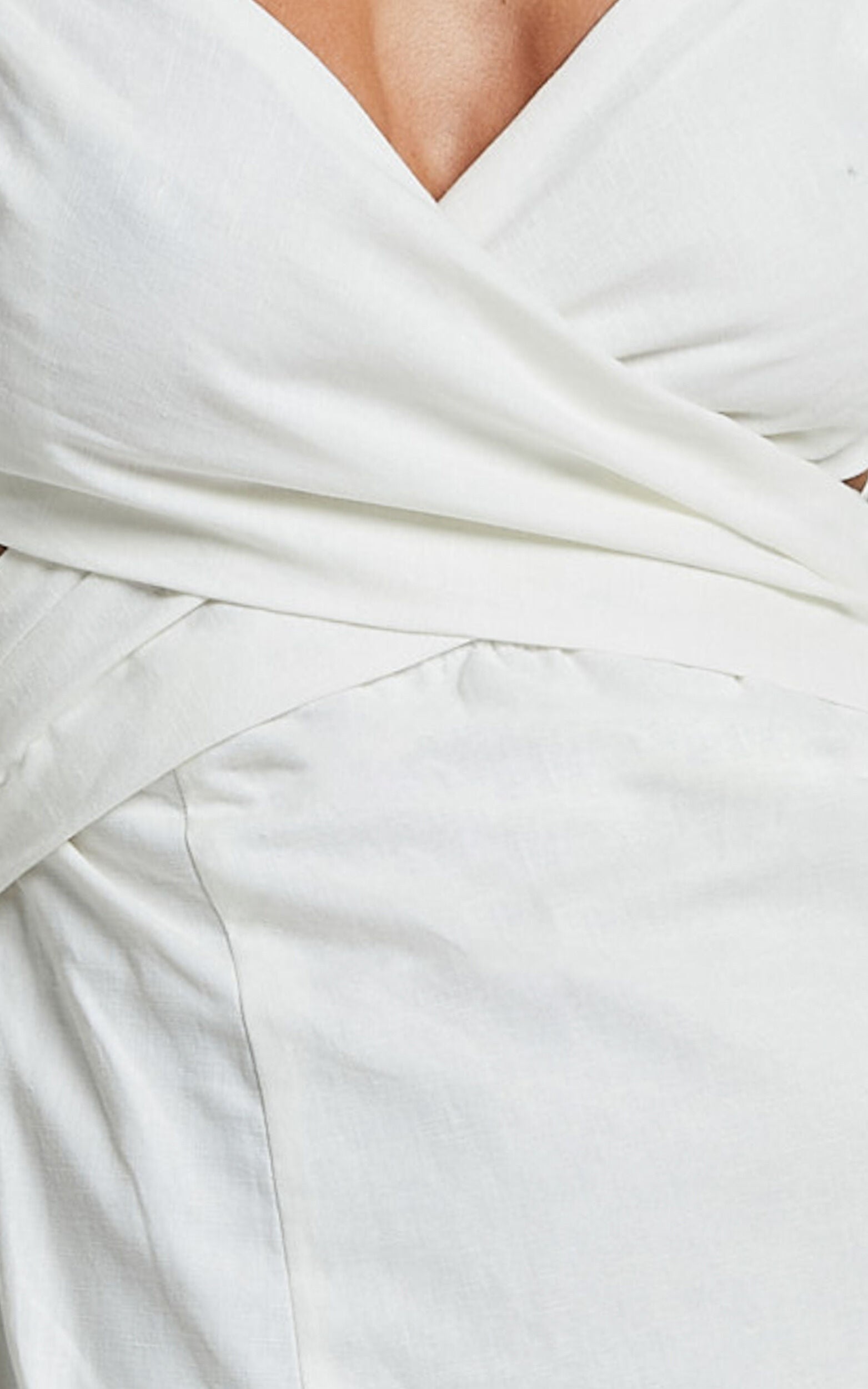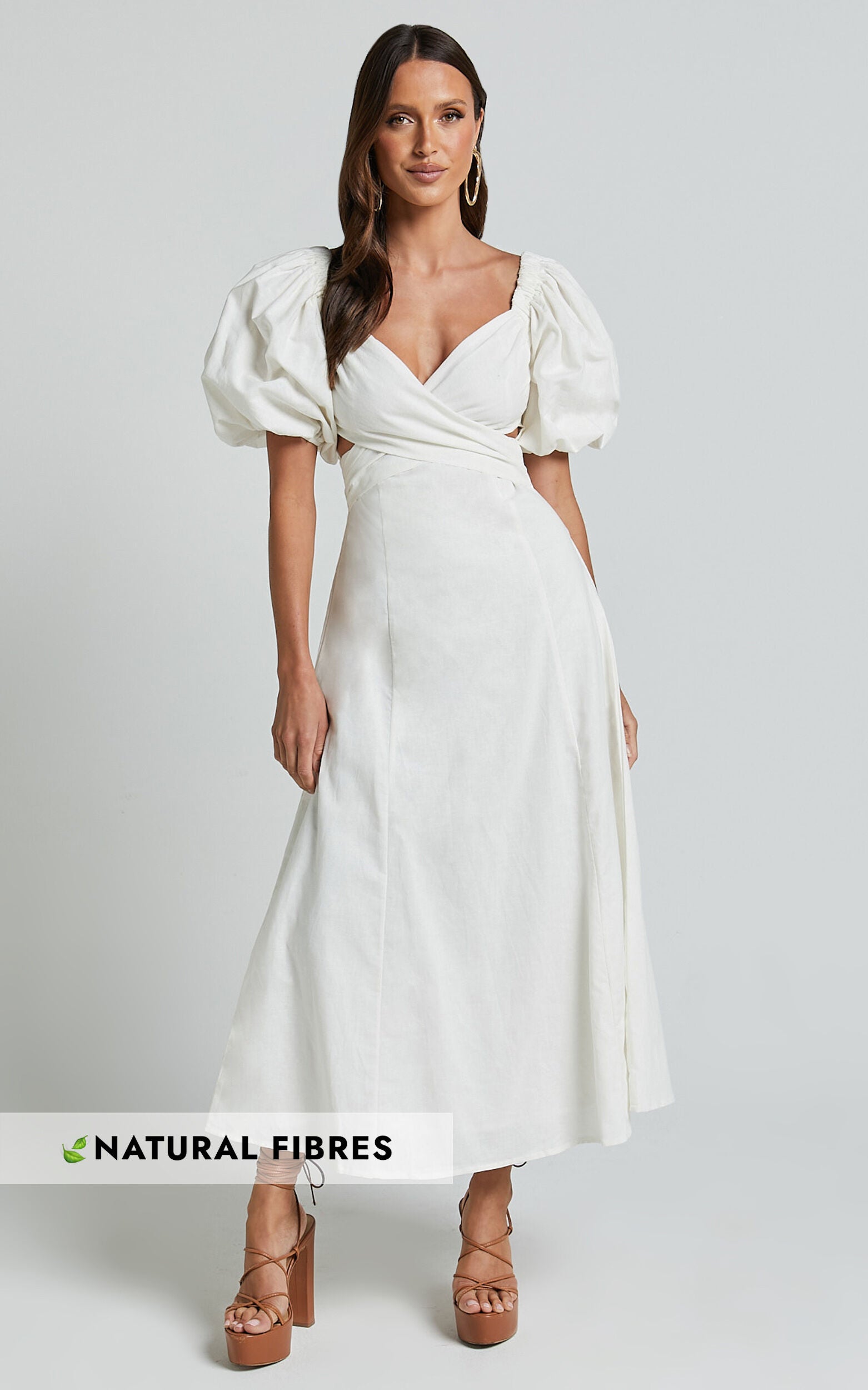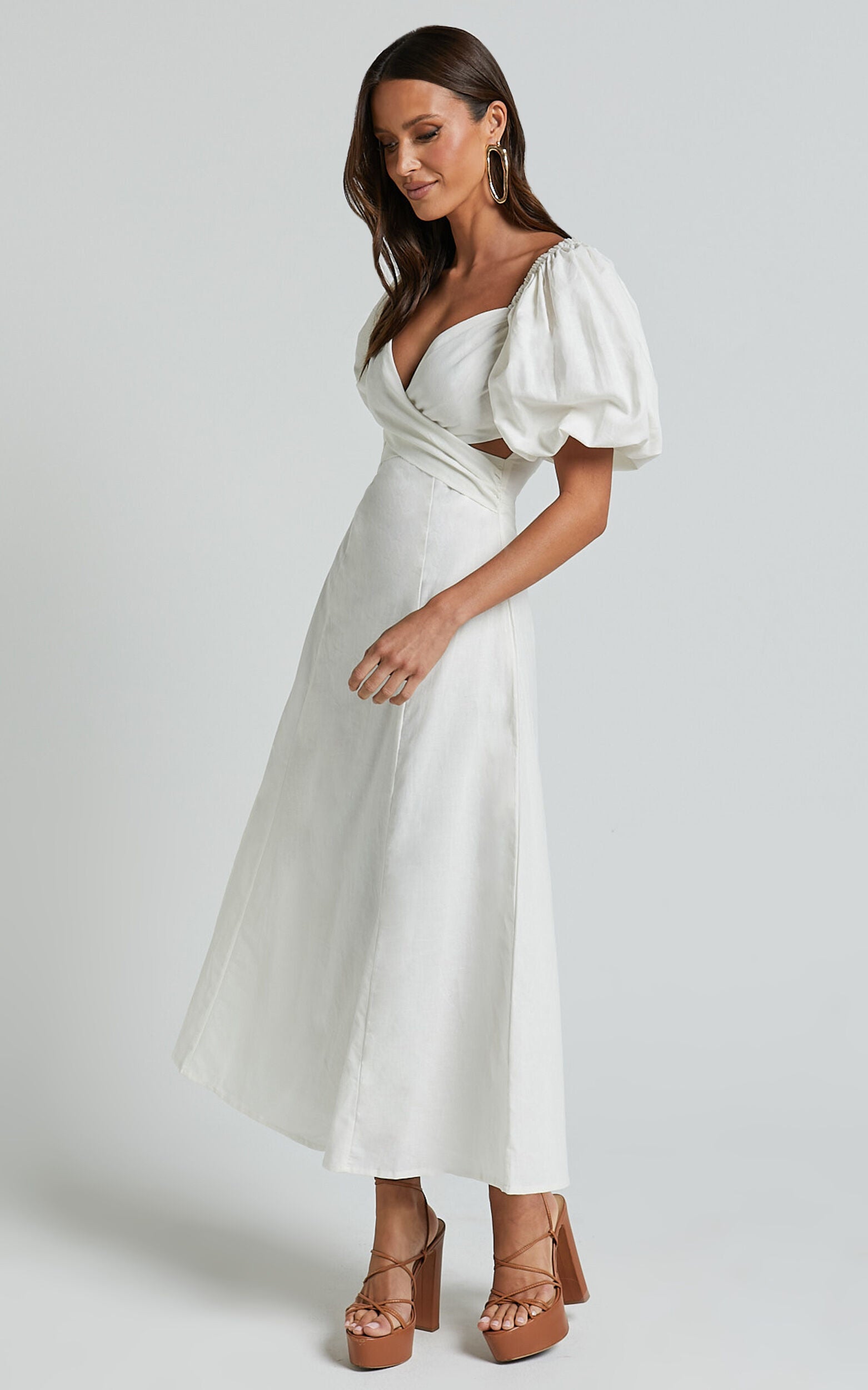 Step into summer with confidence and style in the Amalie The Label Janae Midi Dress. Crafted from a comfortable linen blend, this dress features a cross front design and puff sleeves that add a touch of femininity to your outfit. The A-line silhouette flatters all body shapes while the sweetheart neckline adds a playful touch. Whether you're heading to a casual party or enjoying a weekend activity, this white midi dress is perfect for any occasion. Made from breathable cotton and linen, it will keep you cool and comfortable all day long. Elevate your wardrobe with this versatile piece that can be dressed up or down for endless styling options.Product Details:A-line fit and flare dressMade from linen fabricSweetheart necklineMidi lengthShort sleevesPerfect for casual, party or weekend activitiesSize and FitSize S / 8 length: 116cm / 45.67inMaterial and CareMain Fabric: 54% Cotton, 46% Linen Lining: 100% CottonLow / No stretchThe main fabric of this product is made from 100% Natural Fibres, Whilst some of these fibres still have detrimental impacts in thier supply chain, Natural Fibres have a reduced overall impact compared to a raw polyester.