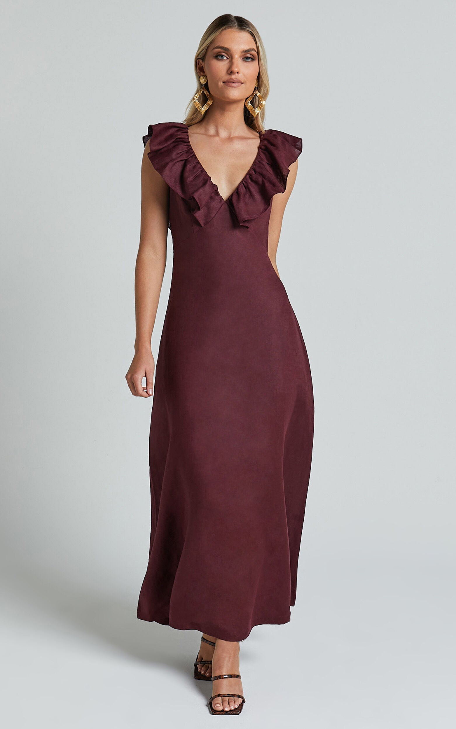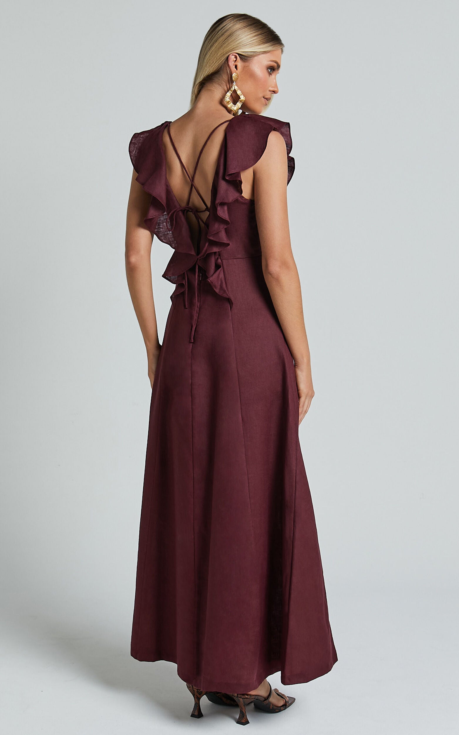 Get ready to turn heads at your next party with the Amalie The Label Penelope Linen Flutter Sleeve Low Back Maxi Dress in Wine. This stunning A-line dress is made from high-quality linen fabric that not only looks amazing, but also feels incredibly comfortable against your skin. With its flattering silhouette and flirty flutter sleeves, this dress is perfect for any occasion. The low back adds a touch of sexiness without being too revealing, making it suitable for both day and evening events. Whether you're attending a wedding or going out for cocktails with friends, this wine-colored maxi dress is sure to make you feel confident and empowered. So why wait? Add a touch of elegance to your wardrobe with the Penelope Linen Flutter Sleeve Low Back Maxi Dress in Wine!Product Details:Pull on styleA-line dressBackless necklineMaxi lengthShort sleevesMade of linen fabricSuitable for partiesSize and FitSize S / 8 length: 138cm / 54.33inMaterial and Care100% LinenNo StretchNatural FibresThe main fabric of this product is made from 100% Natural Fibres. Whilst some of these fibres still have detrimental impacts in their supply chain, Natural Fibres have a reduced overall impact compared to a raw polyester.