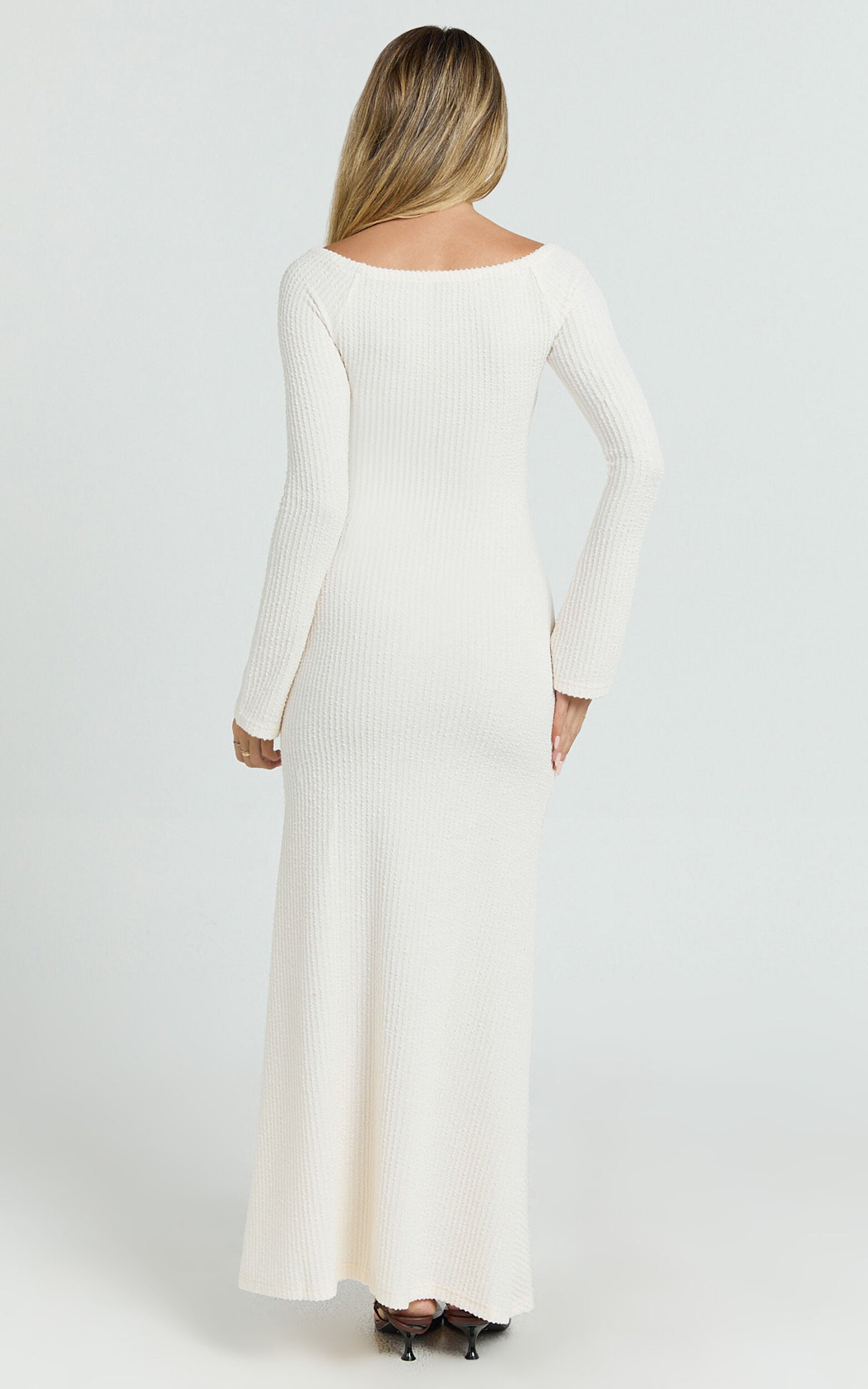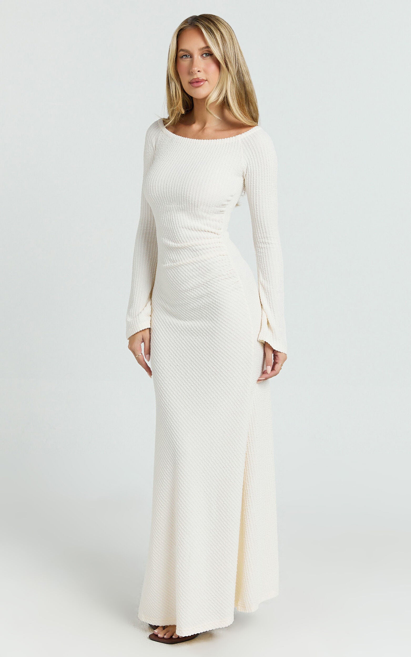 Turn heads in the Ayla Maxi Dress �?your new go-to for looking effortlessly glam! This off-white showstopper features a sultry off-the-shoulder neckline and flared long sleeves, giving total main character energy. Crafted from a ribbed jersey polyester, it hugs your curves with a flattering bodycon fit before cascading into that dreamy mermaid maxi silhouette. Perfect for making an entrance at your next party or brunch, the Ayla is one of those versatile basics you’ll reach for again and again. Style it solo with strappy heels or layer with vintage denim for a chic, laid-back vibe. Dresses this iconic don’t come around often �?say yes to the Ayla and slay all season long!