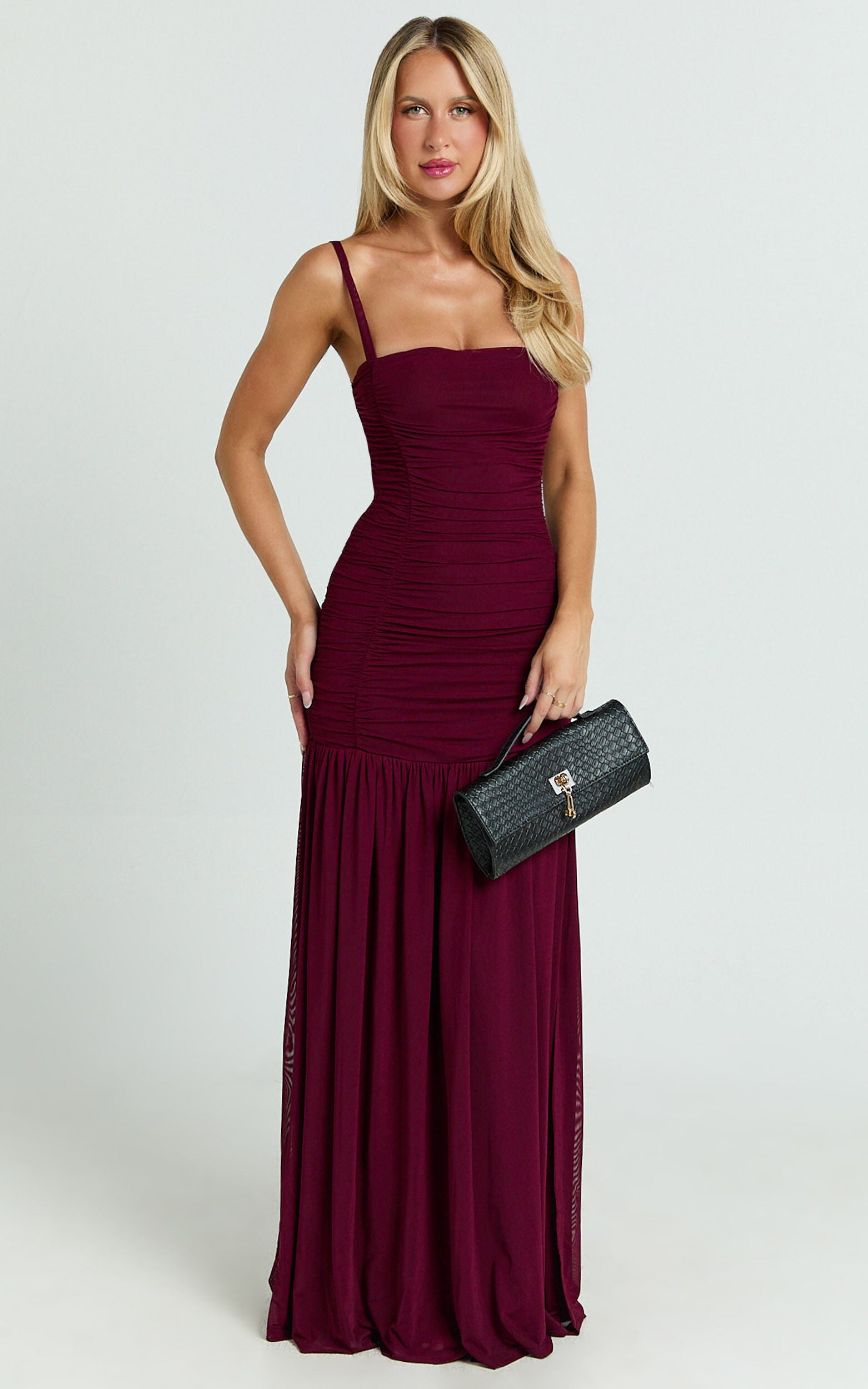 Elevate your wardrobe with our Cardi Maxi Dress - Ruched Mesh High Leg Split Dress in Wine! Designed to empower and flatter, this stunning formal maxi dress ensures you feel as incredible as you look. Crafted in delicate mesh fabric with comfortable polyester lining, its ruched detailing hugs your curves gently, while the halter neckline and sleeveless fit-and-flare silhouette create an effortlessly sophisticated look. Finished in a rich, wine hue that's perfect for weddings, nights out or special occasions, this maxi dress ensures maximum impact everywhere you go. By combining timeless style with modern edge, this empowering dress was made to inspire your confidence and showcase your unique flair.