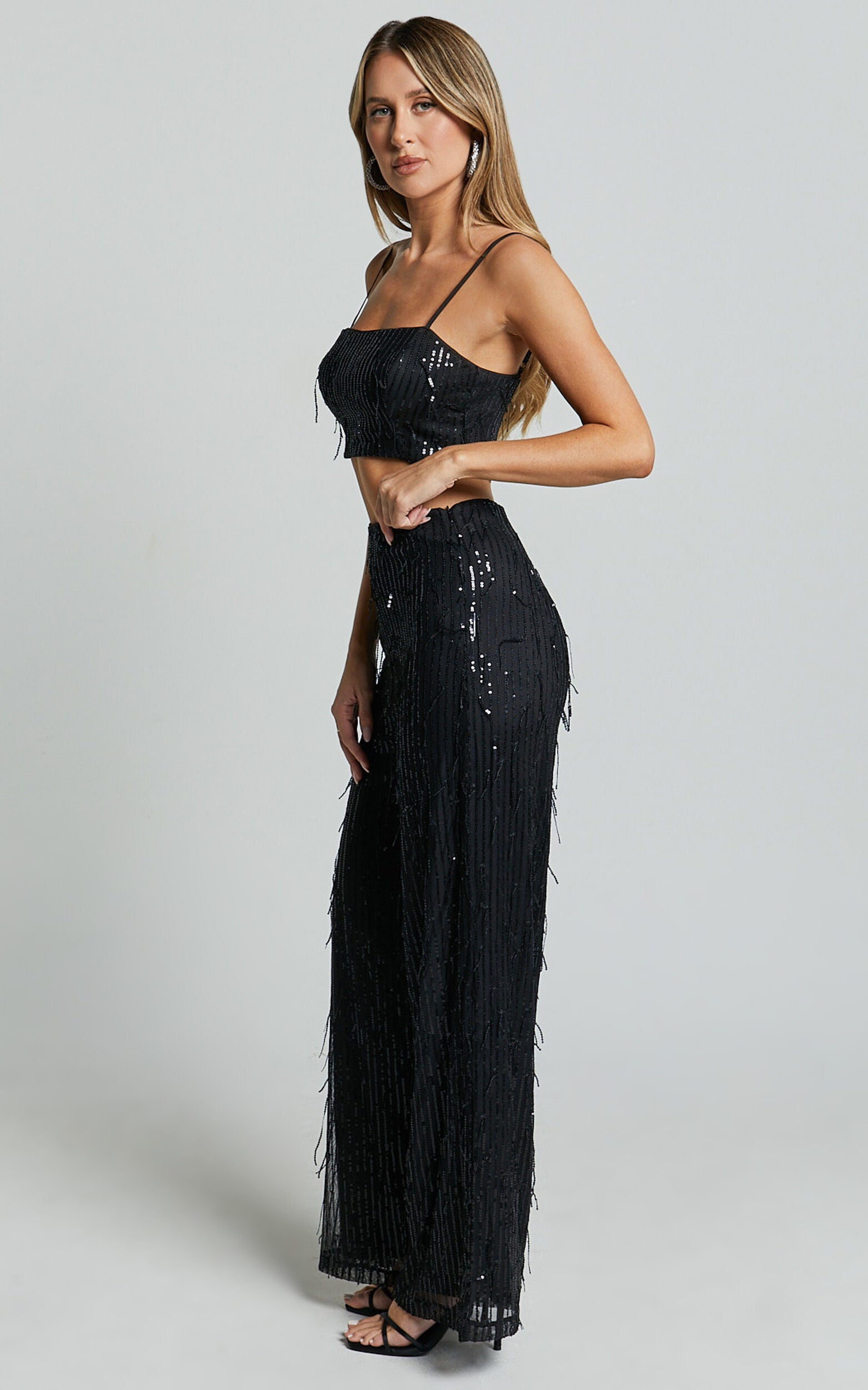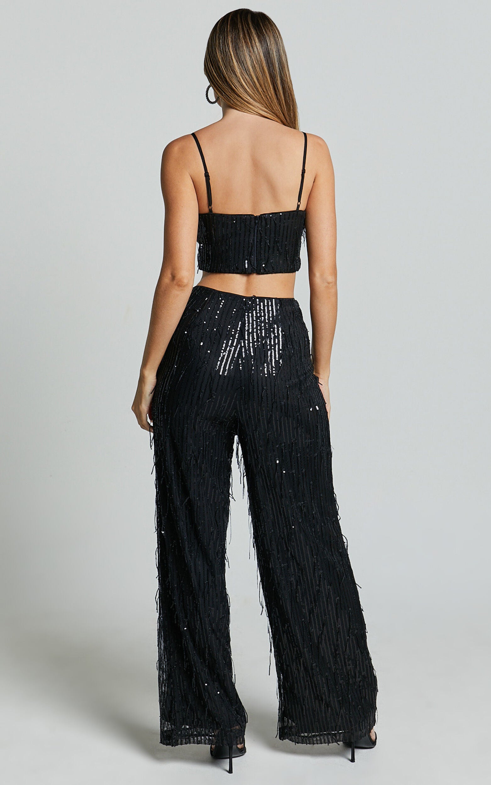 Get ready to turn heads with our Claudette Pants - High Waist Wide Leg Fringe Sequin Pants In Black! These stunning pants are perfect for a party night or any special occasion where you want to make a statement. Made from high-quality polyester, these relaxed fit pants feature an eye-catching sequin design that will shimmer and shine all night long. The high waist and wide leg silhouette flatter your figure while the fringe detailing adds a playful touch. With their full length, these pants can be paired with heels for an effortlessly chic look. Make a bold fashion choice and embrace your inner sparkle with our Claudette Pants!Product Details:Zips featureRelaxed fitSequin fabricFull lengthHigh waistParty night readySize and FitSize S / 8 length: 106cm / 41.73inMaterial and CarePolyesterNo Stretch