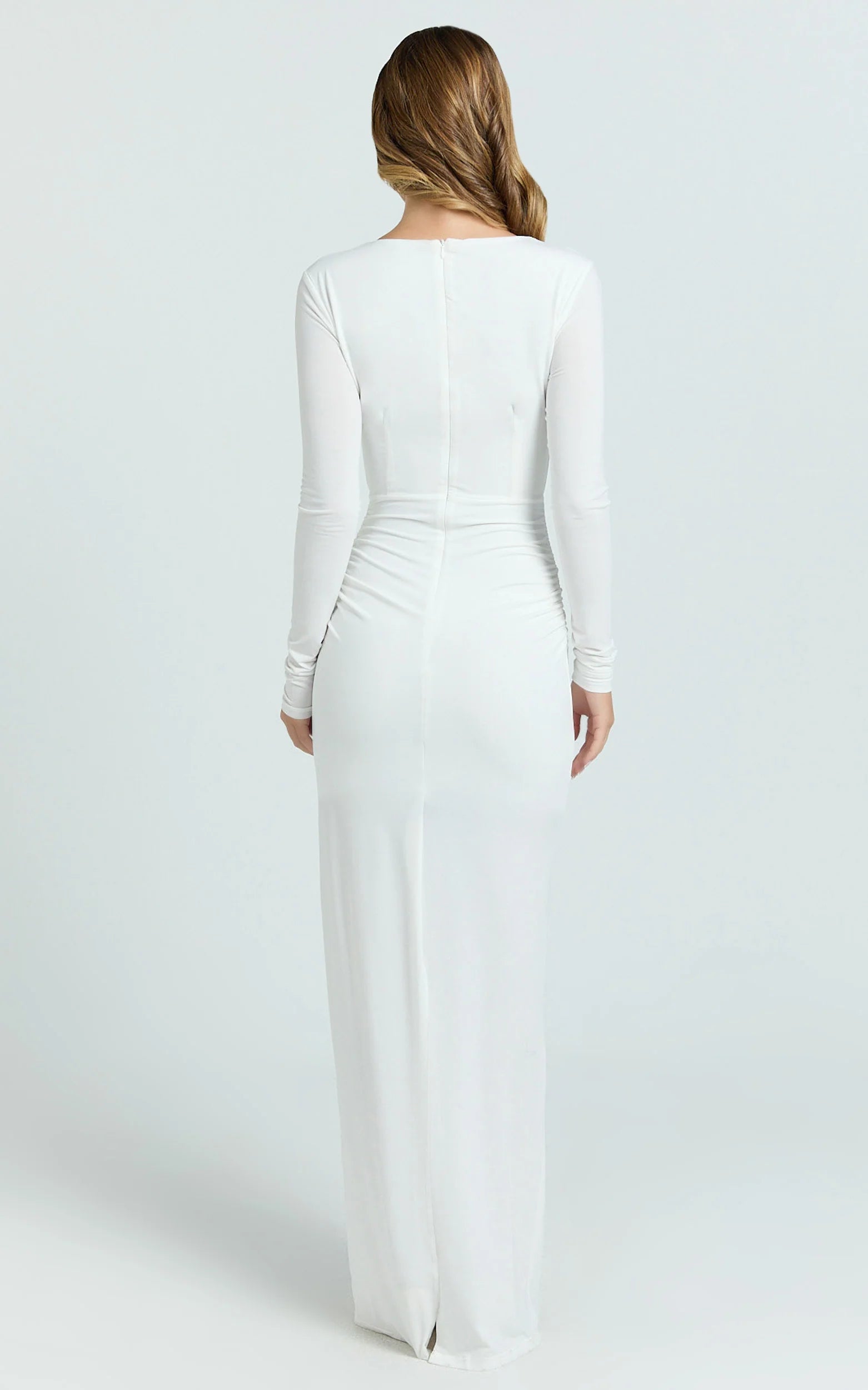The sleek maxi length hugs in all the right places, while the clean V-neck neckline and long sleeves call for luxe simplicity. Consider it your go-to for a bridal shower, dinners and formal events. Minimalist yet head-turning, it nails that femininity with a refined silhouette that feels elevated without trying.