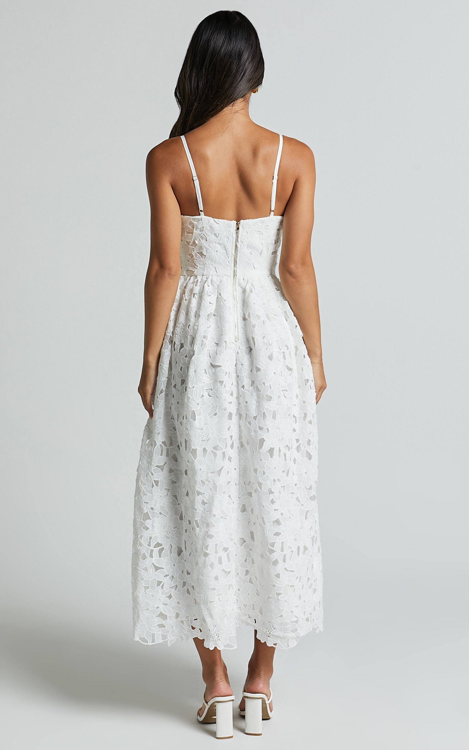 Get ready to turn heads in the Deborah Midi Dress! This stunning white dress features a strappy sweetheart neckline and corset lace details that add a touch of femininity to your look. Made from high-quality polyester, this fit and flare dress is both comfortable and flattering. Perfect for any party day or night, this sleeveless midi dress will make you feel confident and empowered. Whether you're hitting the dance floor or attending a special event, the Deborah Midi Dress will ensure all eyes are on you.Product Details:Sweetheart necklineSleevelessFit & Flare styleMidi lengthMade with lace fabricInner lining for added comfort and coverageFeatures zips for easy wearingPerfect for party day occasionsSize and FitSize S / 8 length: 115cm / 45.28inMaterial and CareMain Fabric: 100% Polyester Lining: 95% Polyester, 5% SpandexNo Stretch