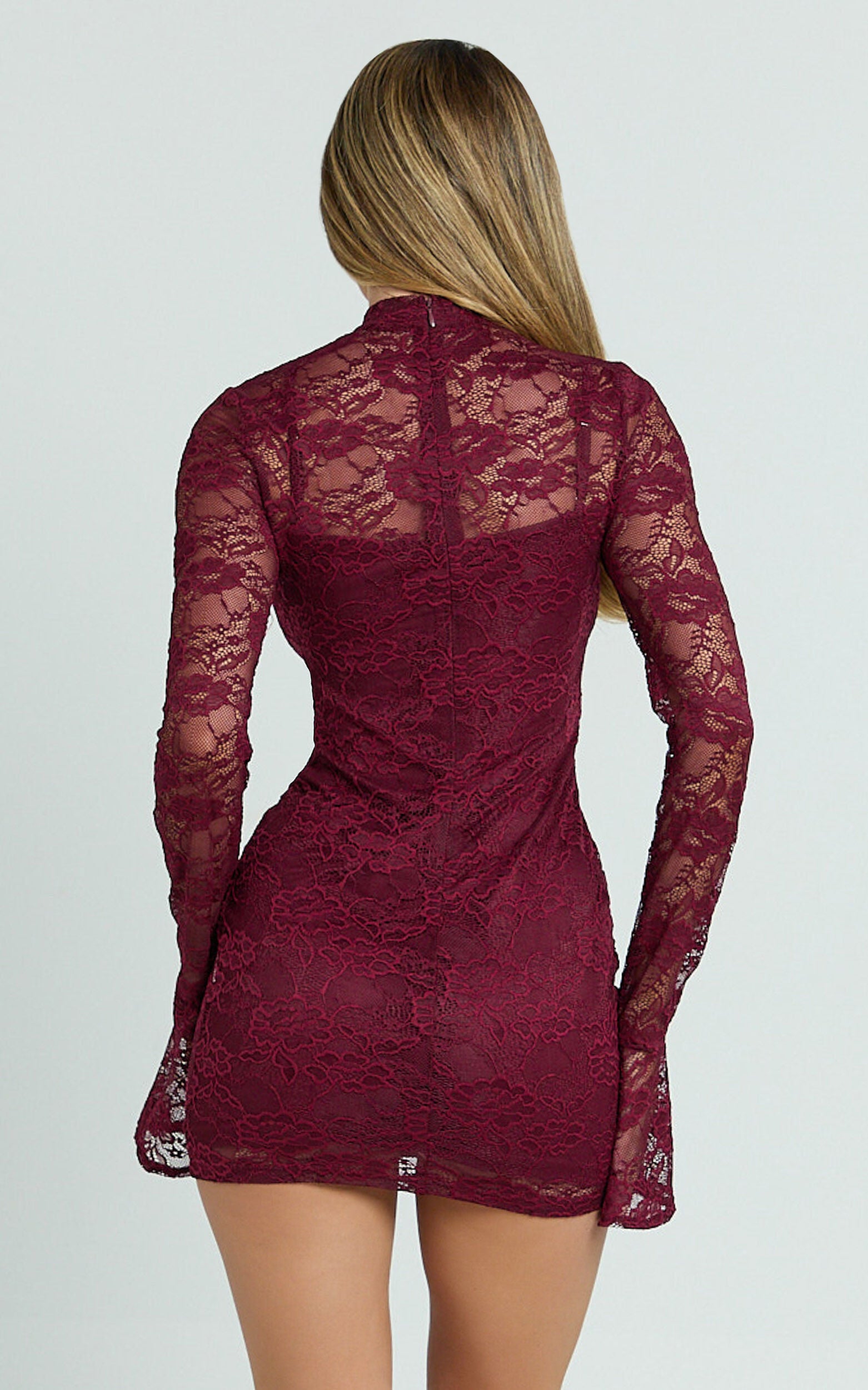 Elevate your wardrobe with the Dexter Mini Dress �C a piece where elegance meets playfulness, perfect for weaving through your social kaleidoscope. Whether it's a party night that calls for some head-turning or a chic hangout with your squad, this wine-hued dress is your new best friend.Product Details:Zips detailInner liningLace fabricHigh necklineParty night perfectMini lengthLong sleeveNylon materialSize and FitSize S / 8 length: 81cm / 31.89inStudio model is wearing size XS / 6 AU / 2 US / 6 UK / 34 EUStudio model's height is 170cm / 5'7''Material and CareMain Fabric: 93% Nylon, 7% Spandex Lining: 100% PolyesterMedium Stretch