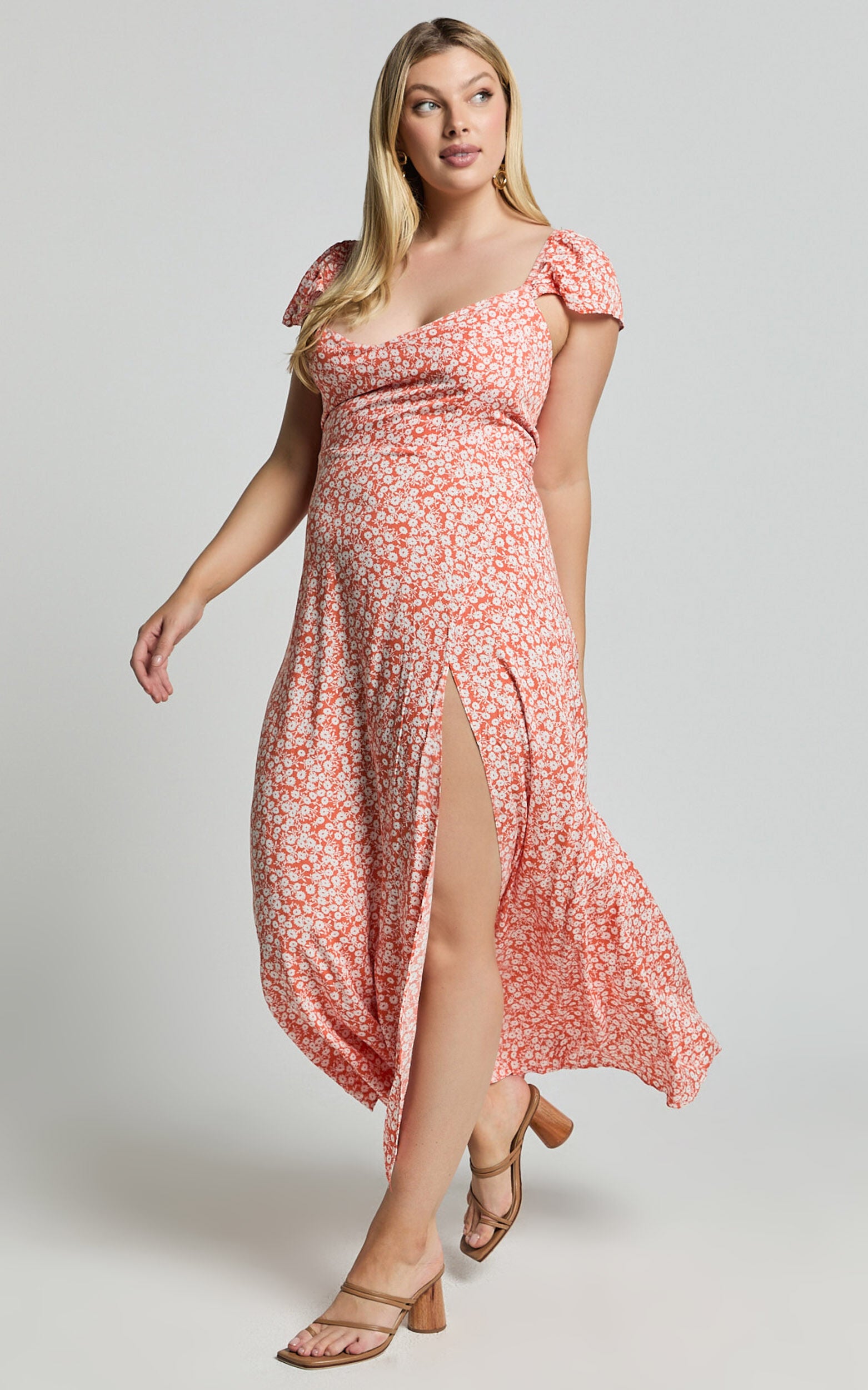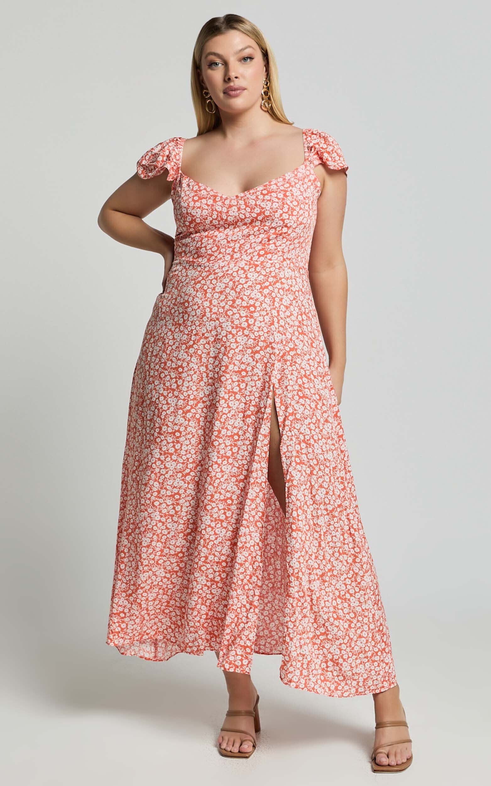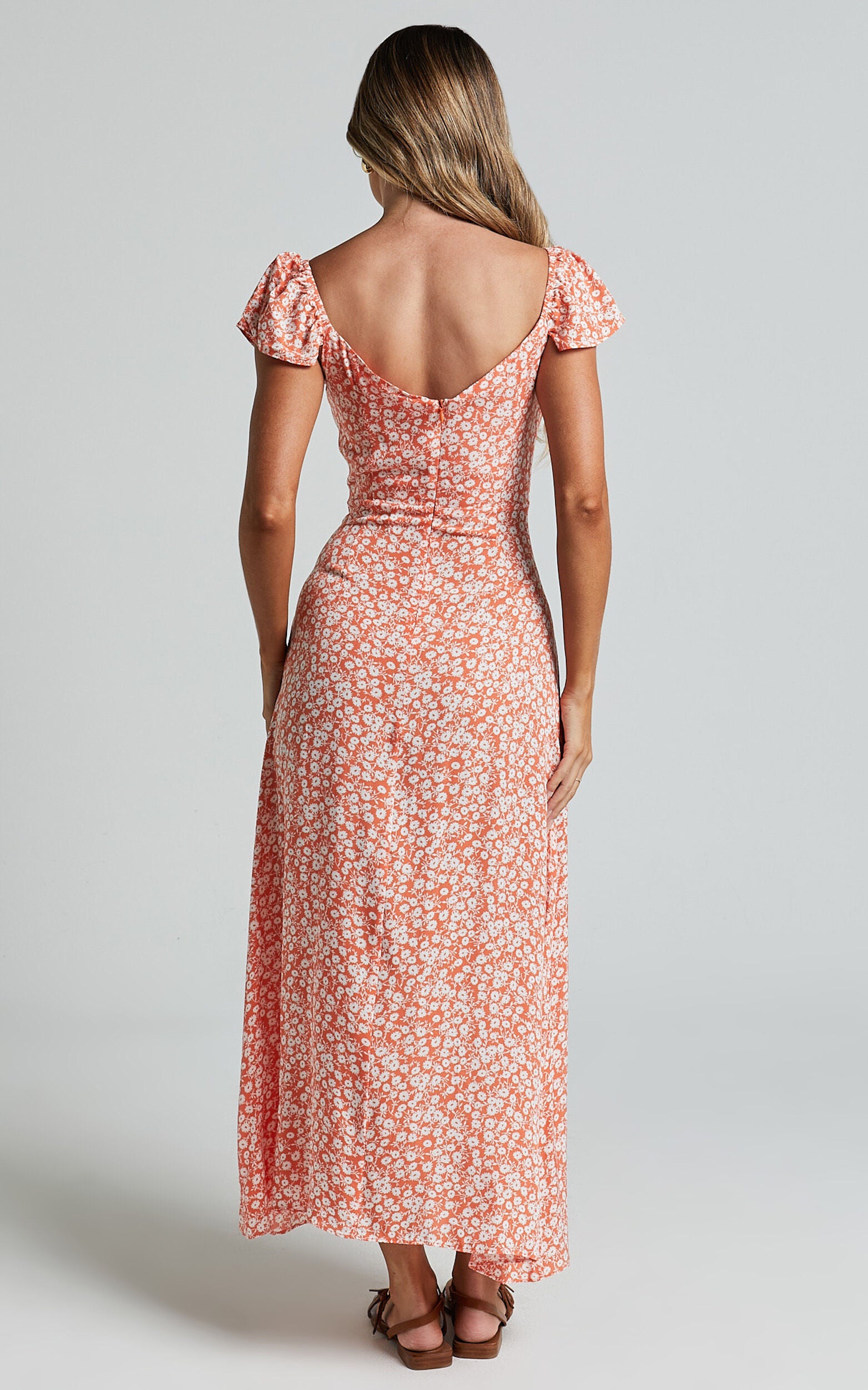 Get ready to turn heads in the Donissa Midaxi Dress. This stunning orange floral dress features a flattering fit and flare silhouette, perfect for any occasion. Its thigh split and flutter sleeves add a touch of femininity, while the sweetheart neckline adds a romantic vibe. Made from lightweight polyester, this dress is comfortable enough for all-day wear. Whether you're going out for brunch with friends or attending a summer party, the Donissa Midaxi Dress is the ultimate choice for your weekend activities.Product Details:Fit & Flare styleSweetheart necklineMidi lengthShort sleeve dressMade from polyester fabricSuitable for casual, party, and weekend activities.Size and FitSize S / 8 length: 116cm / 45.67inMaterial and CareMain Fabric: 100% Polyester Lining: 90% Polyester, 10% ElastaneLow / No stretch