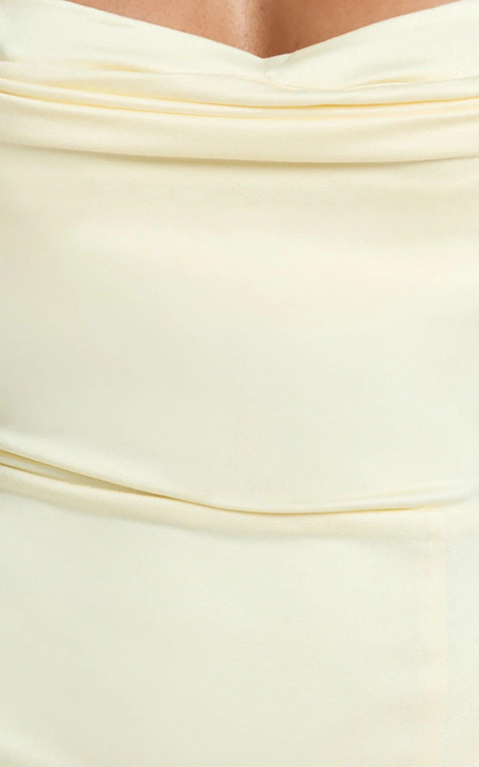 Donna Maxi Dress - Cowl Neck Column High Split Dress In Lemon nails the Balletcore vibe with its fluid lines while pairing perfectly with pendant necklaces for a polished finish. Style it with strappy heels and a mini clutch, then let the leg split do the flirting. A statement piece that photographs beautifully and moves even better.
