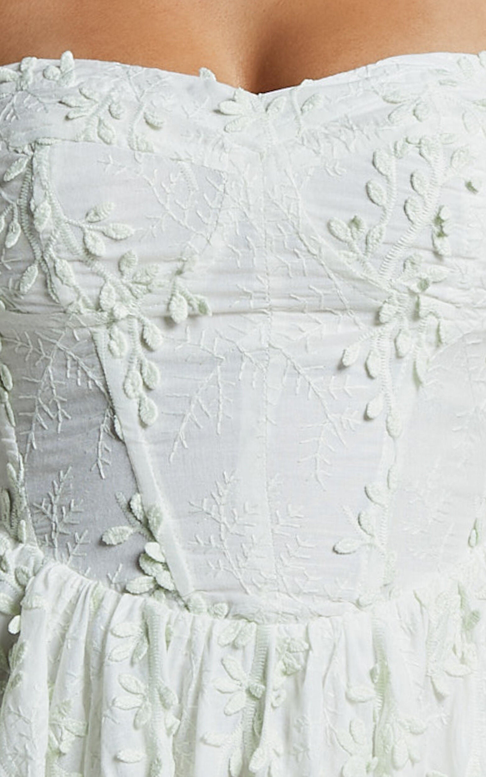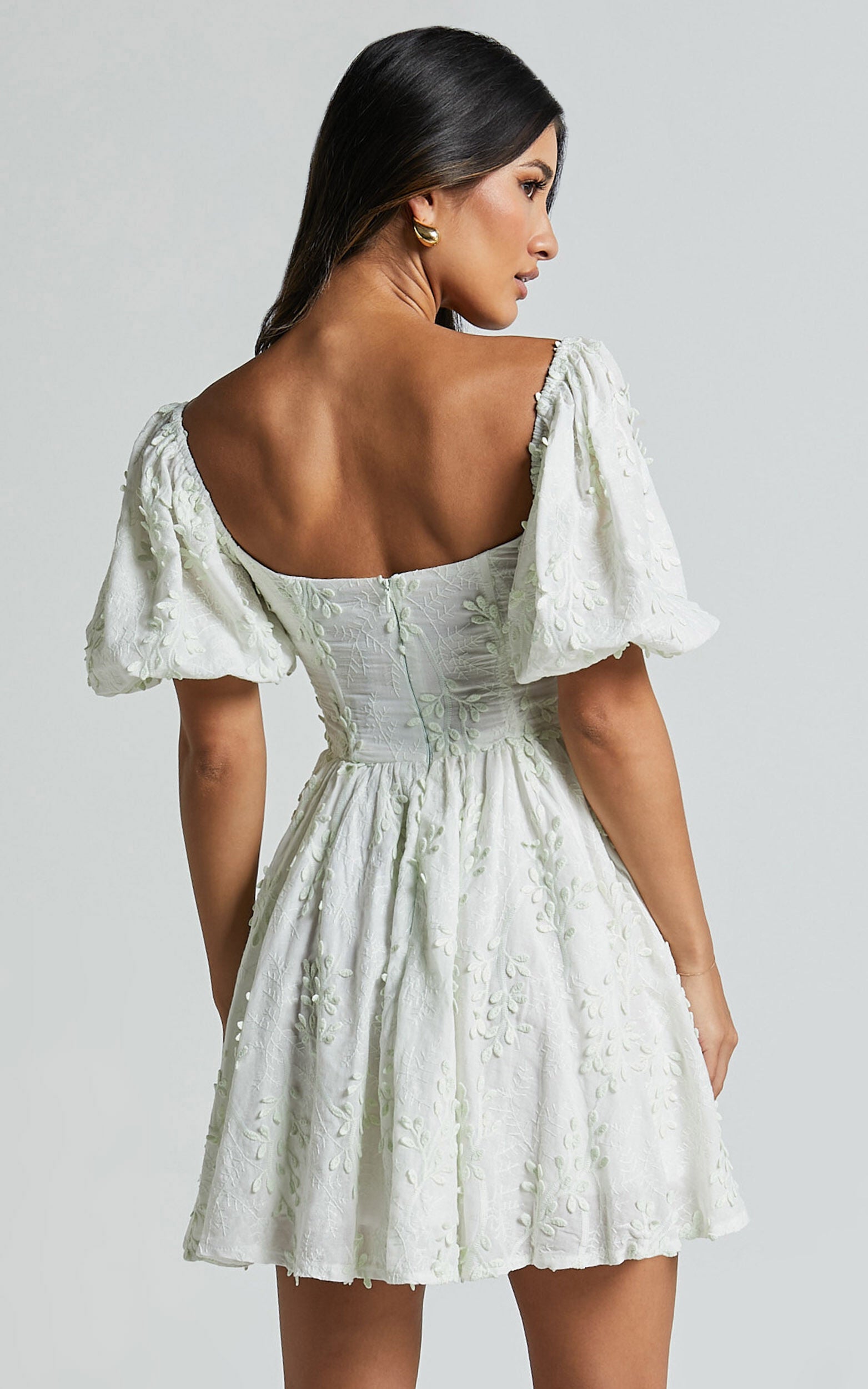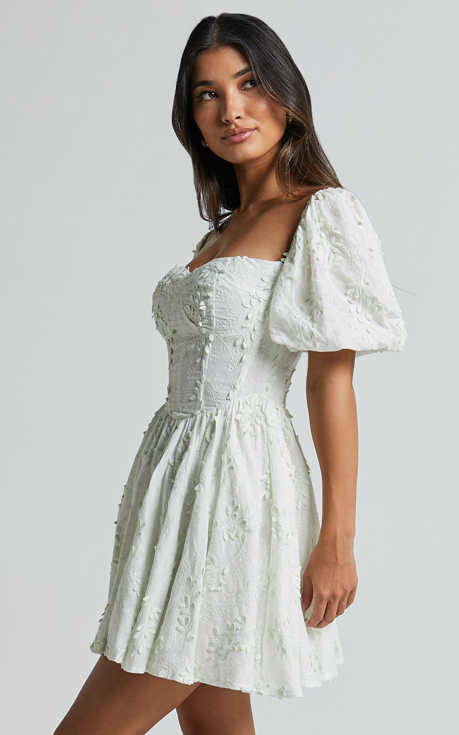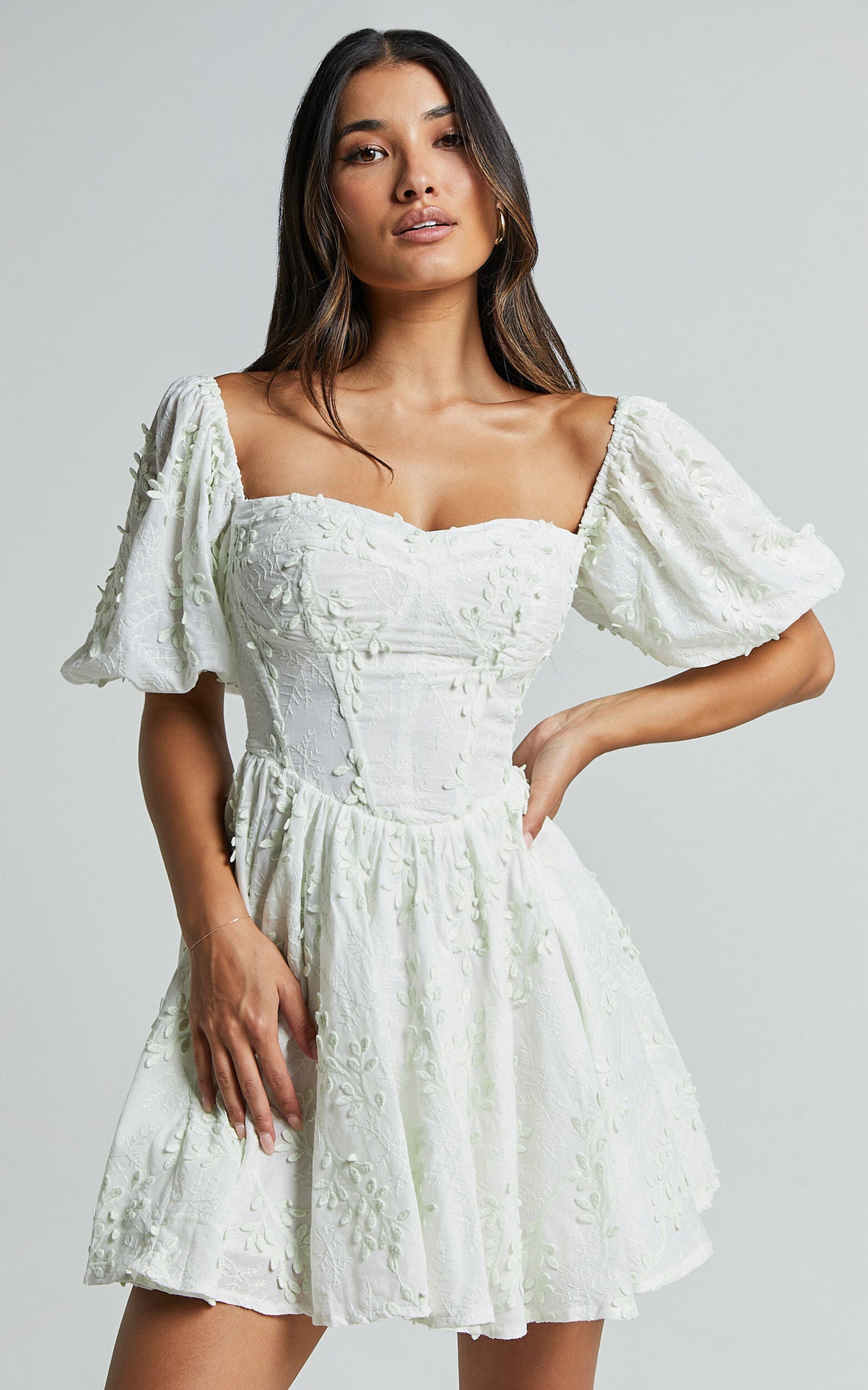 Celebrate the beauty of spring with our Esthela Mini Dress in Pale Mint. This enchanting piece features an embroidered square neck and short puff sleeves, giving it a sweet and feminine look. The corset detail cinches your waist for a flattering fit, while the flowy fit-and-flare silhouette adds a touch of romance to your outfit. Made from soft cotton fabric, this dress is perfect for both day-time parties and special occasions. Embrace your unique style and feel empowered in this gorgeous mini dress that exudes confidence and elegance.Product Details:Fit & Flare DressCotton fabricSweetheart necklineParty Day end useMini lengthShort sleevesSize and FitSize S / 8 length: 63.5cm / 25inMaterial and CareMain Fabric: 100% CottonLow / No stretchNatural FibresThe main fabric of this product is made from 100% Natural Fibres. Whilst some of these fibres still have detrimental impacts in their supply chain, Natural Fibres have a reduced overall impact compared to a raw polyester.