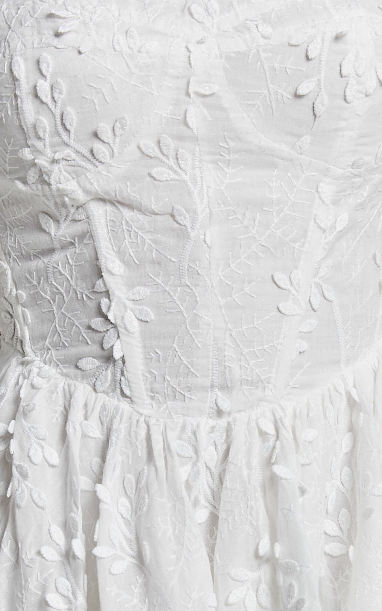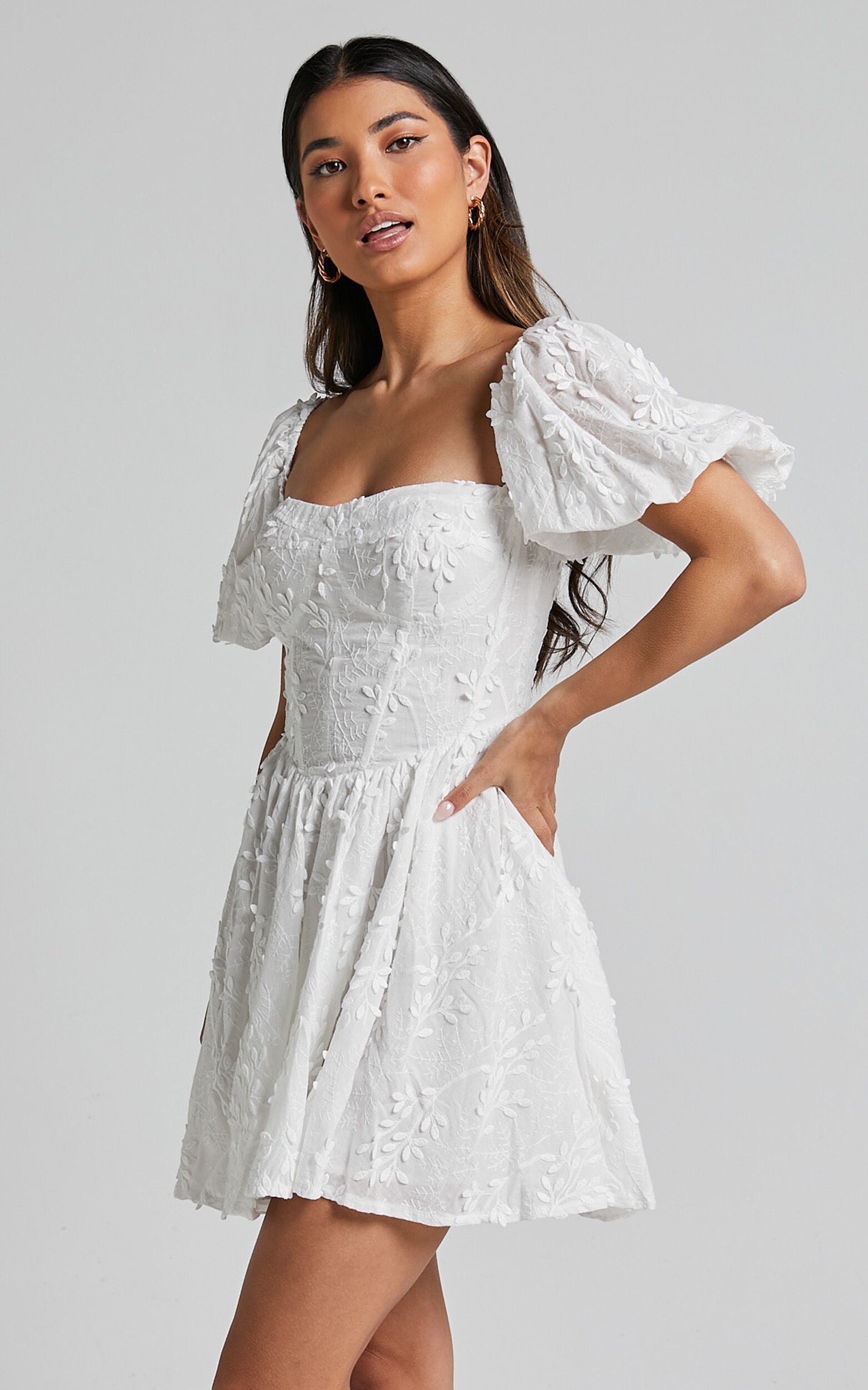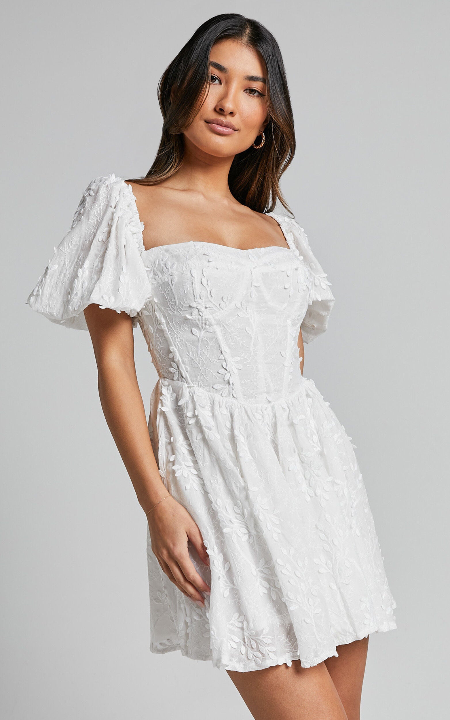Get ready to turn heads in the Esthela Mini Dress - a romantic and flirty dress that is perfect for any occasion. This stunning white floral dress features an embroidered square neckline, short puff sleeves, and a flattering corset waist. Made from lightweight cotton fabric, this fit and flare mini dress is both comfortable and stylish. Whether you're attending a spring party or spending the day out with friends, the Esthela Mini Dress will make you feel like the belle of the ball. Embrace your inner sweetheart and show off your style in this must-have dress.Product Details:Fit & Flare DressCotton fabricSweetheart necklineMini lengthShort sleevesPerfect for Spring and Party Day occasionsSize and FitSize S / 8 length: 63.5cm / 25inMaterial and CareMain Fabric: 100% CottonLow / No stretchThe main fabric of this product is made from 100% Natural Fibres, Whilst some of these fibres still have detrimental impacts in thier supply chain, Natural Fibres have a reduced overall impact compared to a raw polyester.