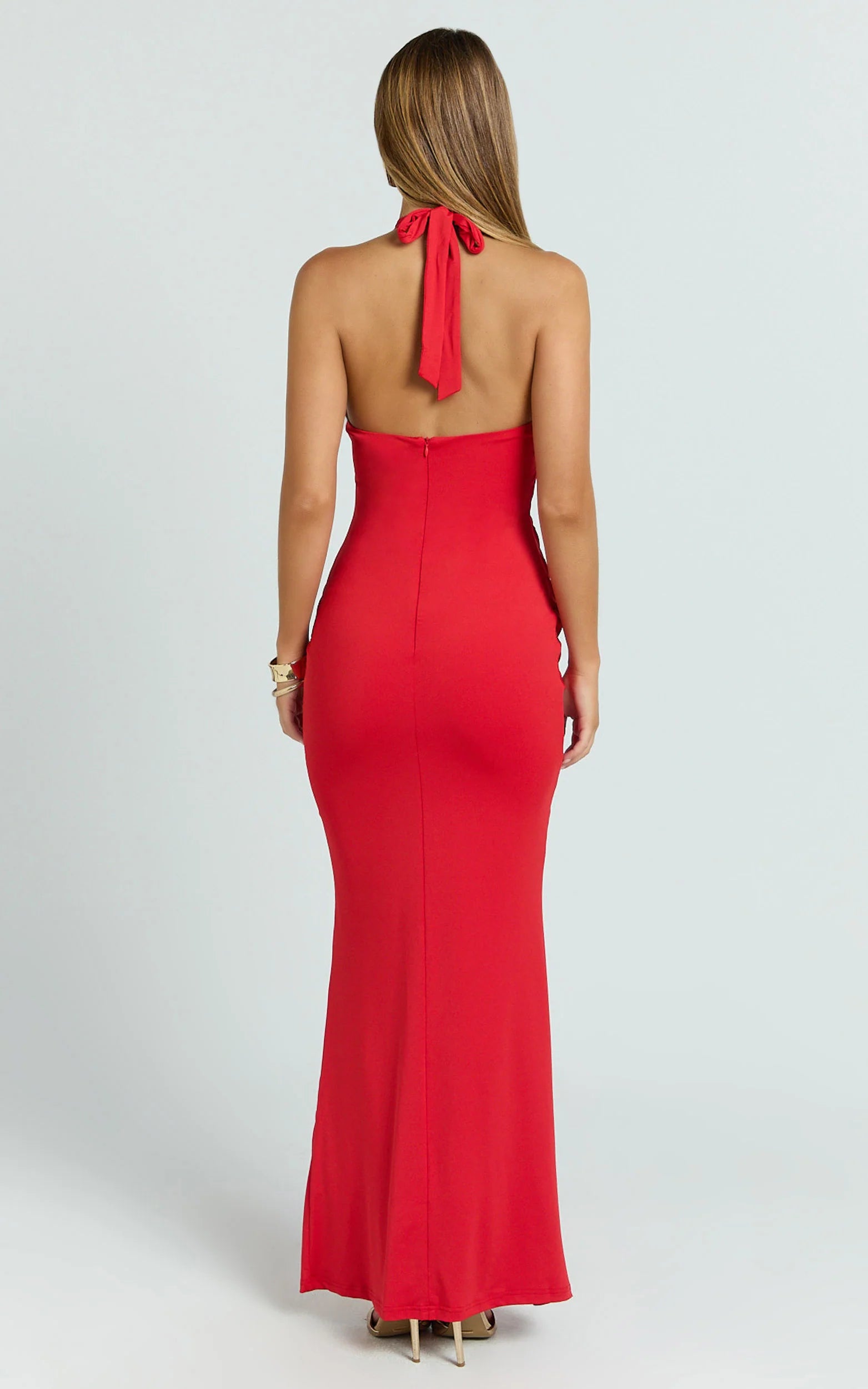 A scoop halter neckline frames the decolletage, while a drape-front skirt and back split bring fluid movement and an ultra-flattering silhouette. Consider it your go-to for event Dresses, date nights, and holiday parties, bold, confident, and seriously photogenic.