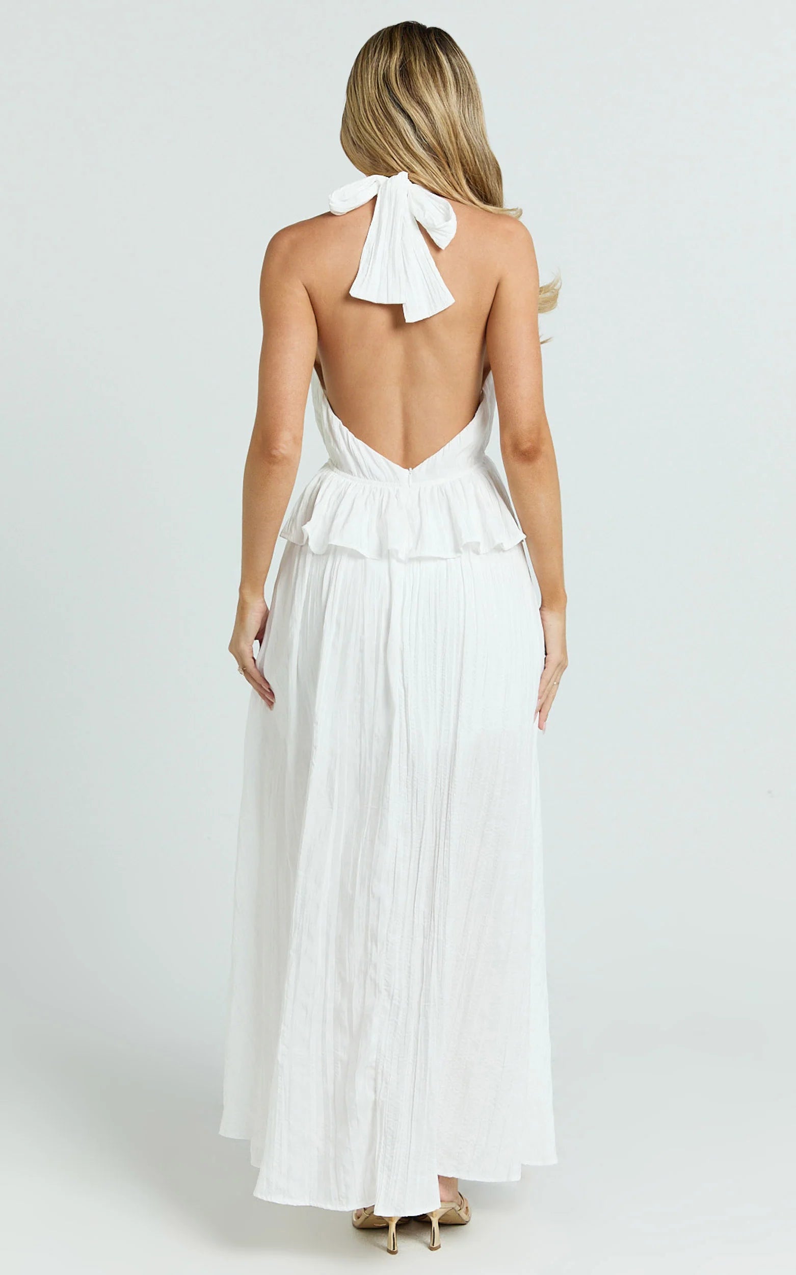 This white maxi turns every entrance into a moment with its deep V halter neckline, chic brooch detail, and a thigh-high split that elongates the silhouette. Sleek, sculptural volumes meet clean lines for a high-shine finish that photographs beautifully, perfect for parties, brides-to-be, and all-white dress codes.