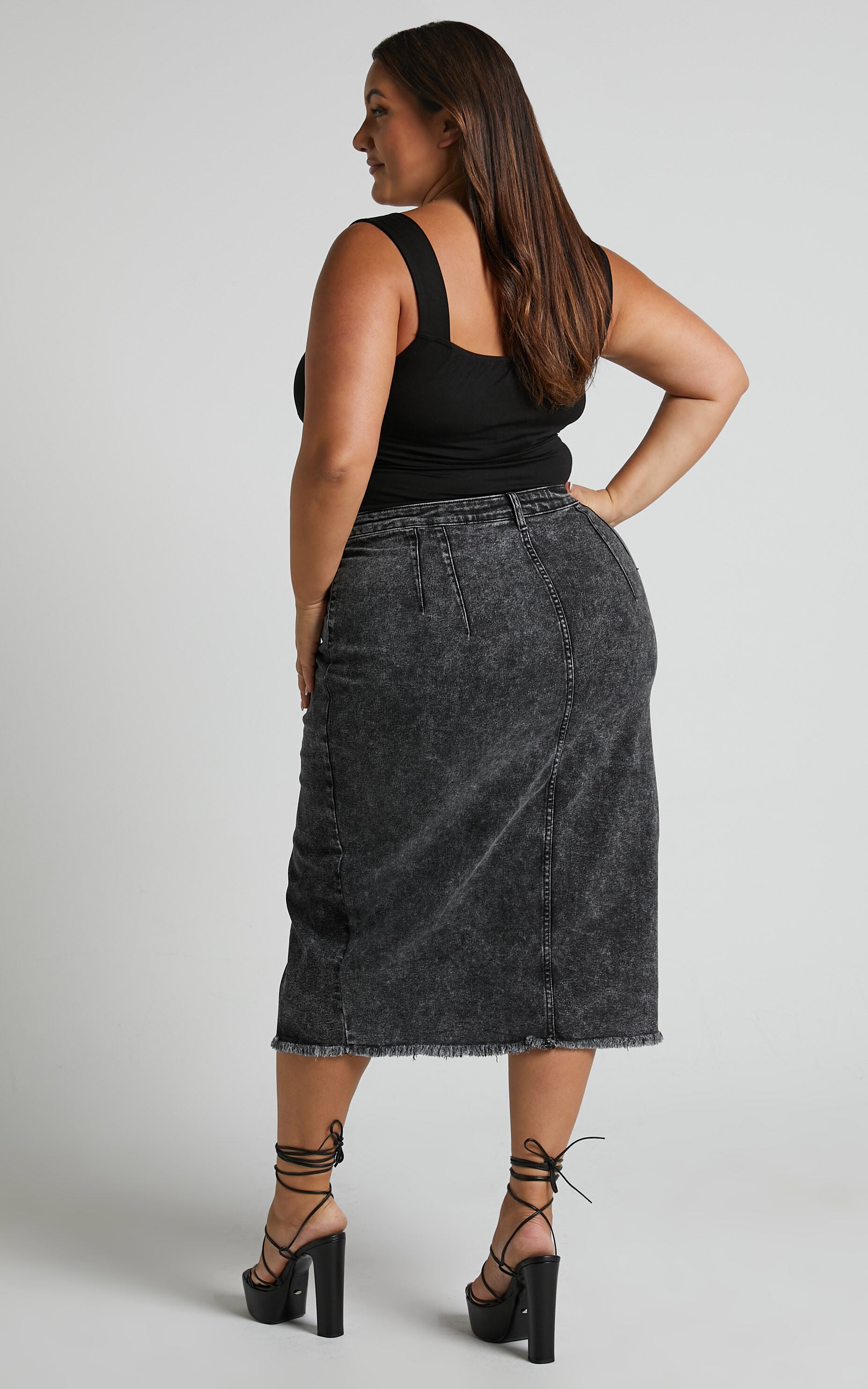 Rock a stylish and edgy look with our Janeve Midi Skirt in Black Acid Wash. This denim skirt is the perfect combination of casual and chic, making it an essential piece for any fashion-forward wardrobe. With its front split design, it adds a modern twist to the classic pencil skirt silhouette. Made from high-quality denim fabric, this midi skirt is not only trendy but also comfortable to wear all day long. Pair it with your favorite crop top or oversized sweater for an effortlessly cool outfit that will turn heads wherever you go. Crafted from 100% cotton, this black acid wash denim skirt is a must-have addition to your collection of skirts. Shop now and elevate your style game with Showpo!Product Details:Denim pencil skirtMidi lengthHigh waist styleMade from cotton fabricSize and FitSize S / 8 length: 80cm / 31.5inStudio model is wearing size XS / 6 AU / 2 US / 6 UK / 34 EUStudio model measurements are:Height: 170cm / 5'7''Bust: 84cm / 33''Waist: 61cm / 24''Hip: 88cm / 35''Studio model is wearing size XXXL / 18 AU / 14 US / 18 UK / 46 EUStudio model measurements are:Height: 172cm / 5'8''Bust: 111cm / 44''Waist: 91cm / 36''Hip: 129cm / 51''Material and CareMain Fabric: 22.7% Polyester, 9.7% Viscose, 0.9% Elastane, 66.7% CottonLow / No stretch