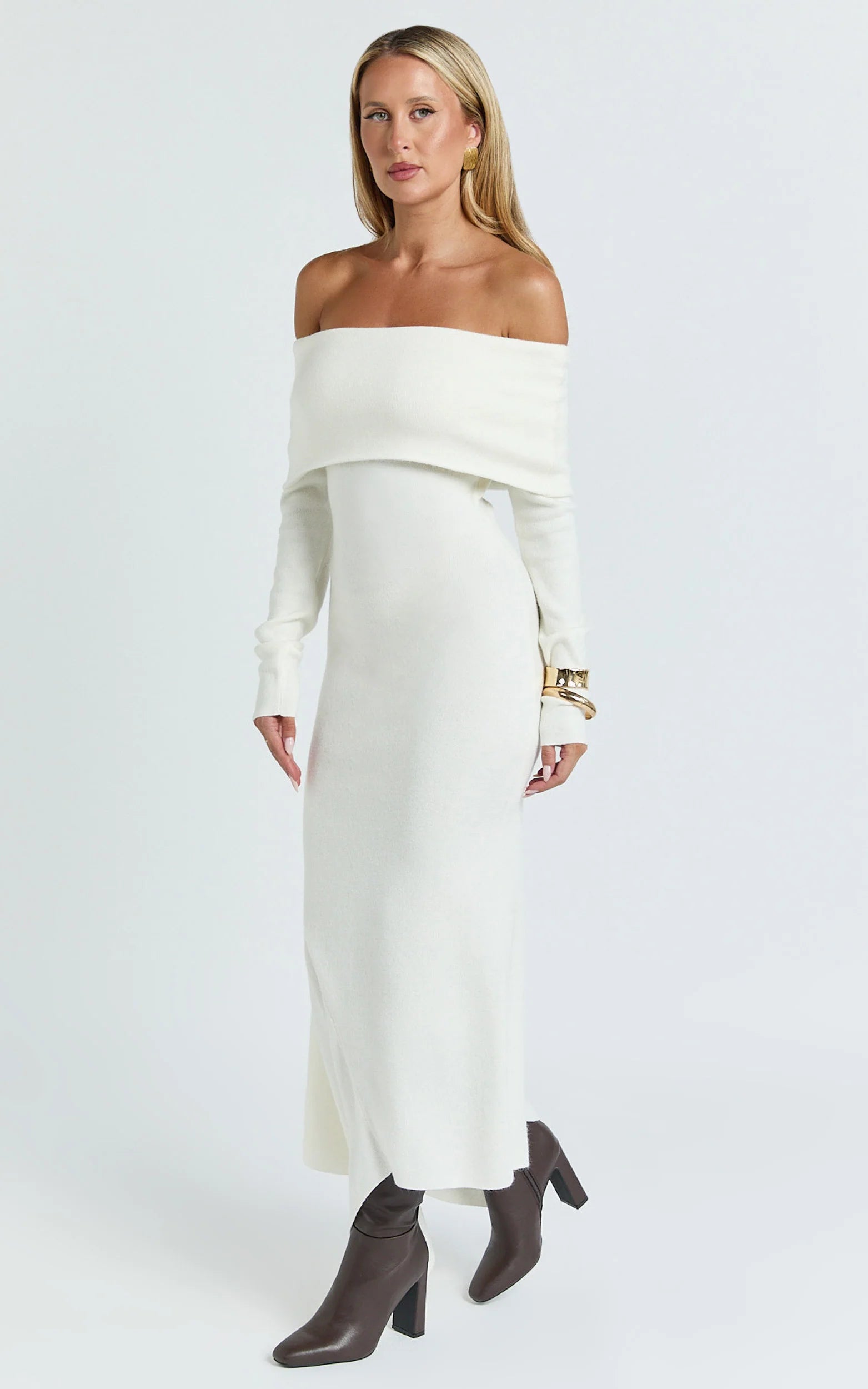 Designed with a folded off-shoulder neckline and asymmetric hem, it brings an elevated edge to classic dresses while flattering every move. The long sleeves add a touch of vintage-inspired sophistication, perfect for styling day-to-night.