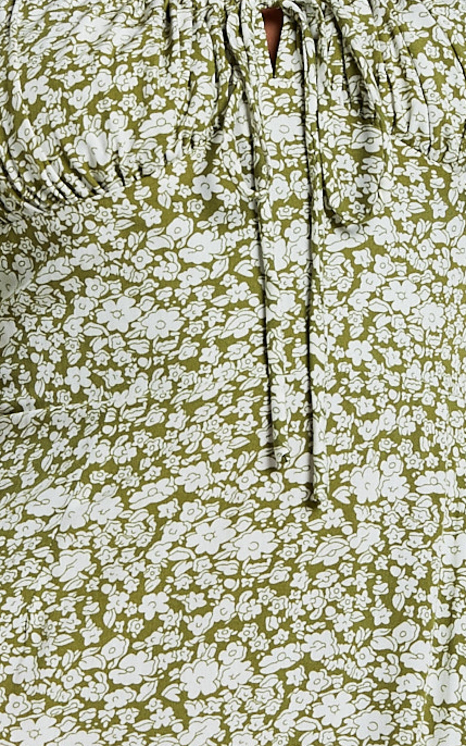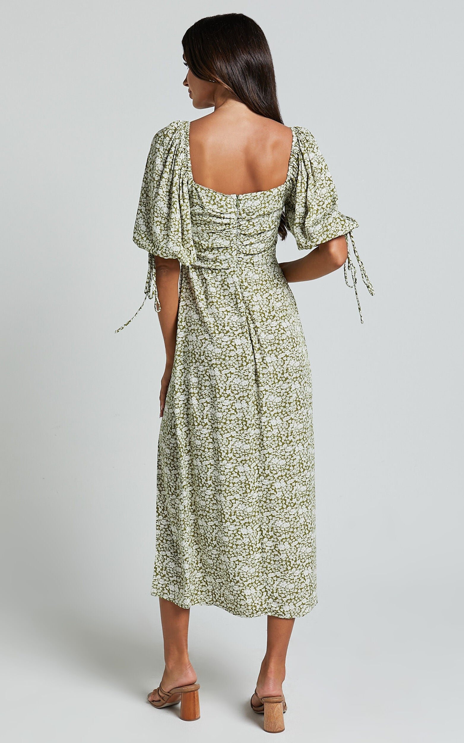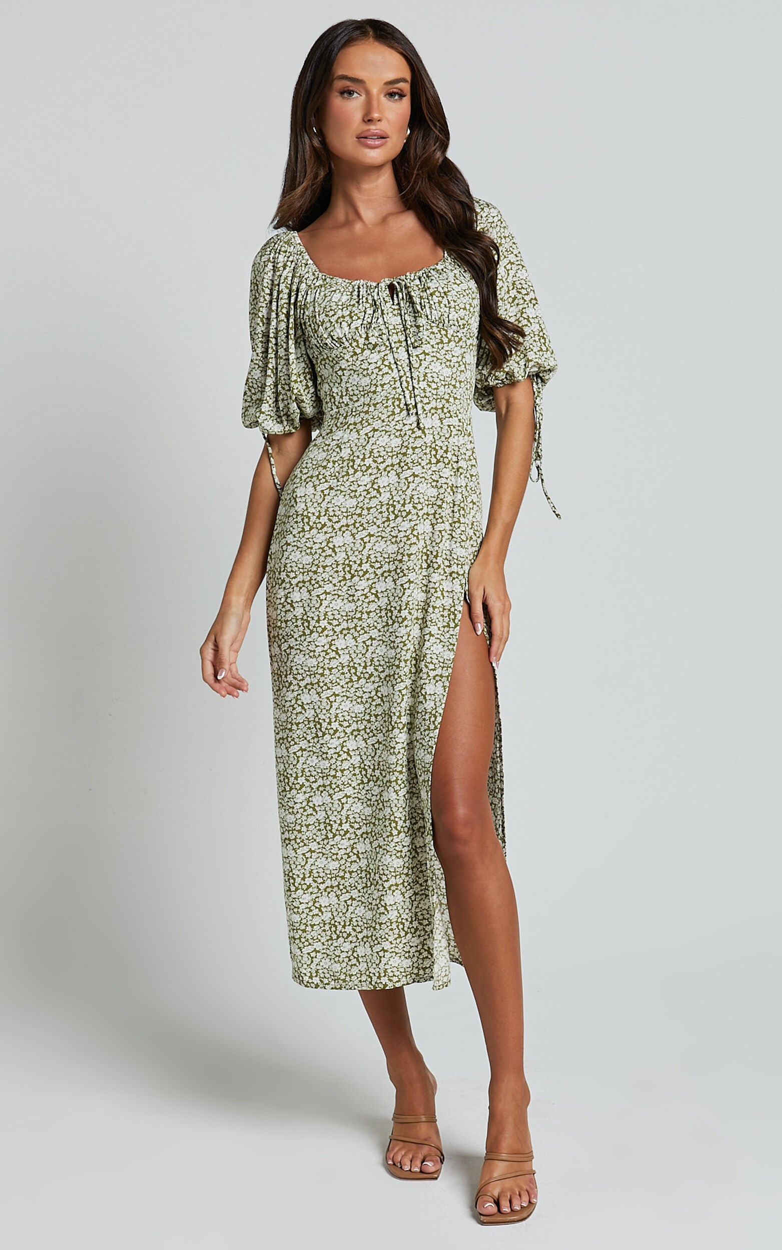 Feel effortlessly chic in our Rosario Midi Dress. This stunning dress features a ruched bust and puff sleeves, adding a touch of romance to your everyday style. Made from comfortable rayon fabric, this slip dress is perfect for casual days or dressing up for special occasions. The flattering sweetheart neckline and fitted silhouette create an ultra-feminine look that will turn heads wherever you go. Whether you're running errands or enjoying brunch with friends, this olive floral midi dress is a must-have addition to your wardrobe. Embrace your unique style and make a statement with Showpo's Rosario Midi Dress!Product Details:Slip dress, day dress, fitted dressesRayon fabricSweetheart necklineCasual end useMidi lengthShort sleevesSize and FitSize S / 8 length: 112cm / 44.09inMaterial and CareMain Fabric: 100% Rayon Lining: 95% Polyester, 5% SpandexLow / No stretch