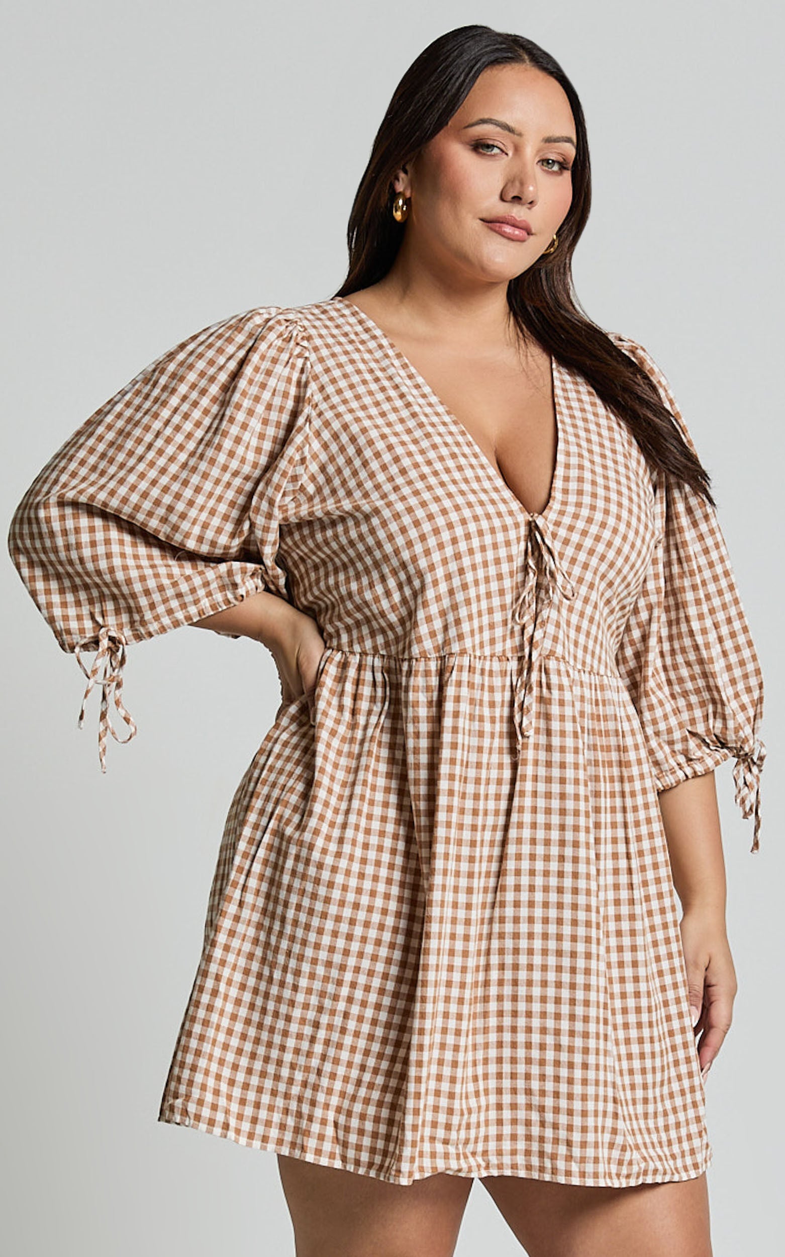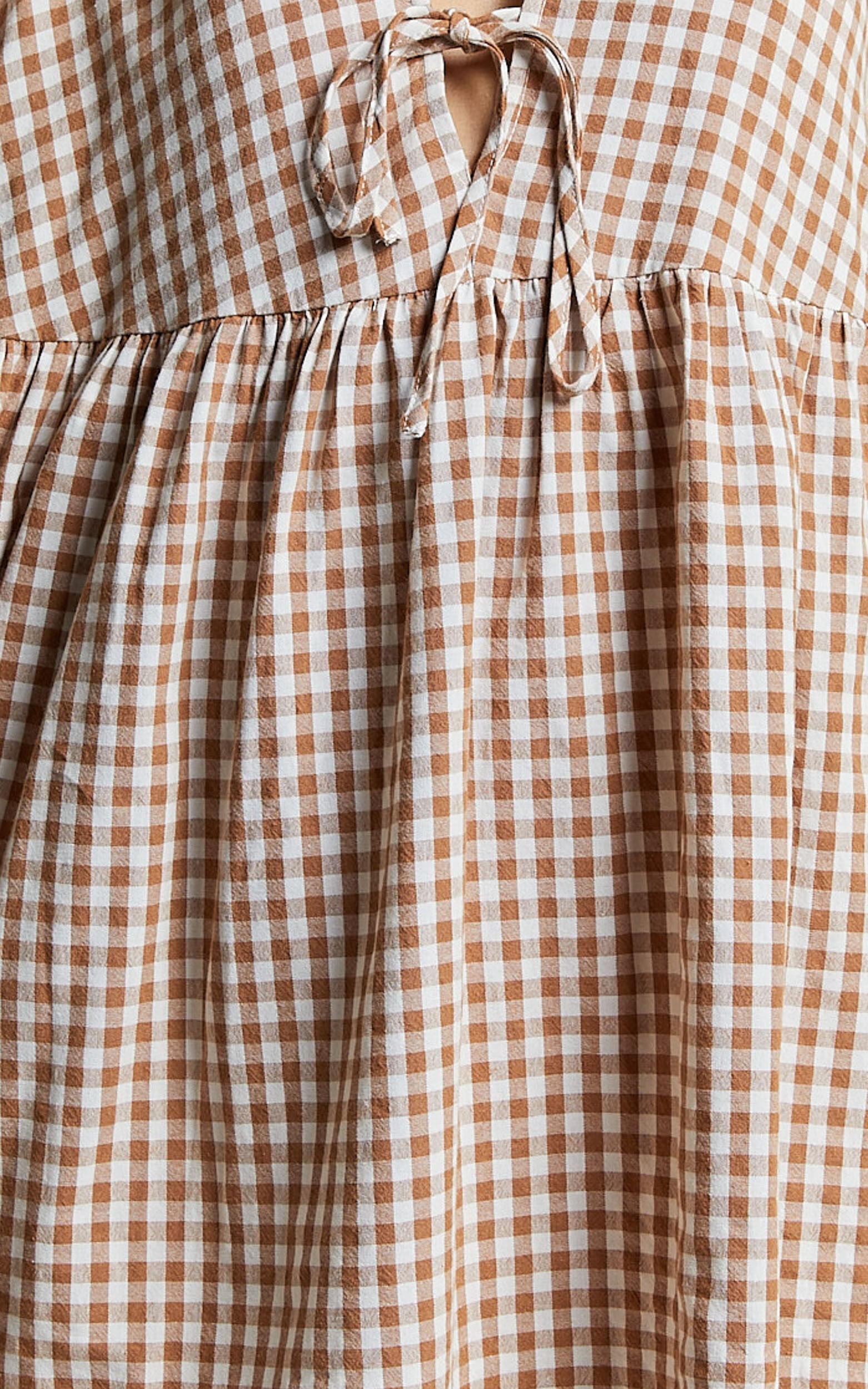 Add a touch of sweetness to your wardrobe with our Rosita Mini Dress in Caramel & White Gingham. This adorable dress features a flattering V neck and tie front detail, perfect for any casual day out or weekend activity. Made from soft cotton fabric, it offers both comfort and style. The 3/4 sleeves add an extra feminine touch to this mini dress that is sure to turn heads wherever you go. Embrace your individuality and rock this brown gingham beauty for a look that exudes confidence and charm.Product Details:Mini length day dressMade of cotton fabricV-neckline with 3/4 sleevesPerfect for casual and weekend activitiesSuitable for summer seasonSize and FitSize S / 8 length: 85cm / 33.46inMaterial and CareCottonLow / No stretch