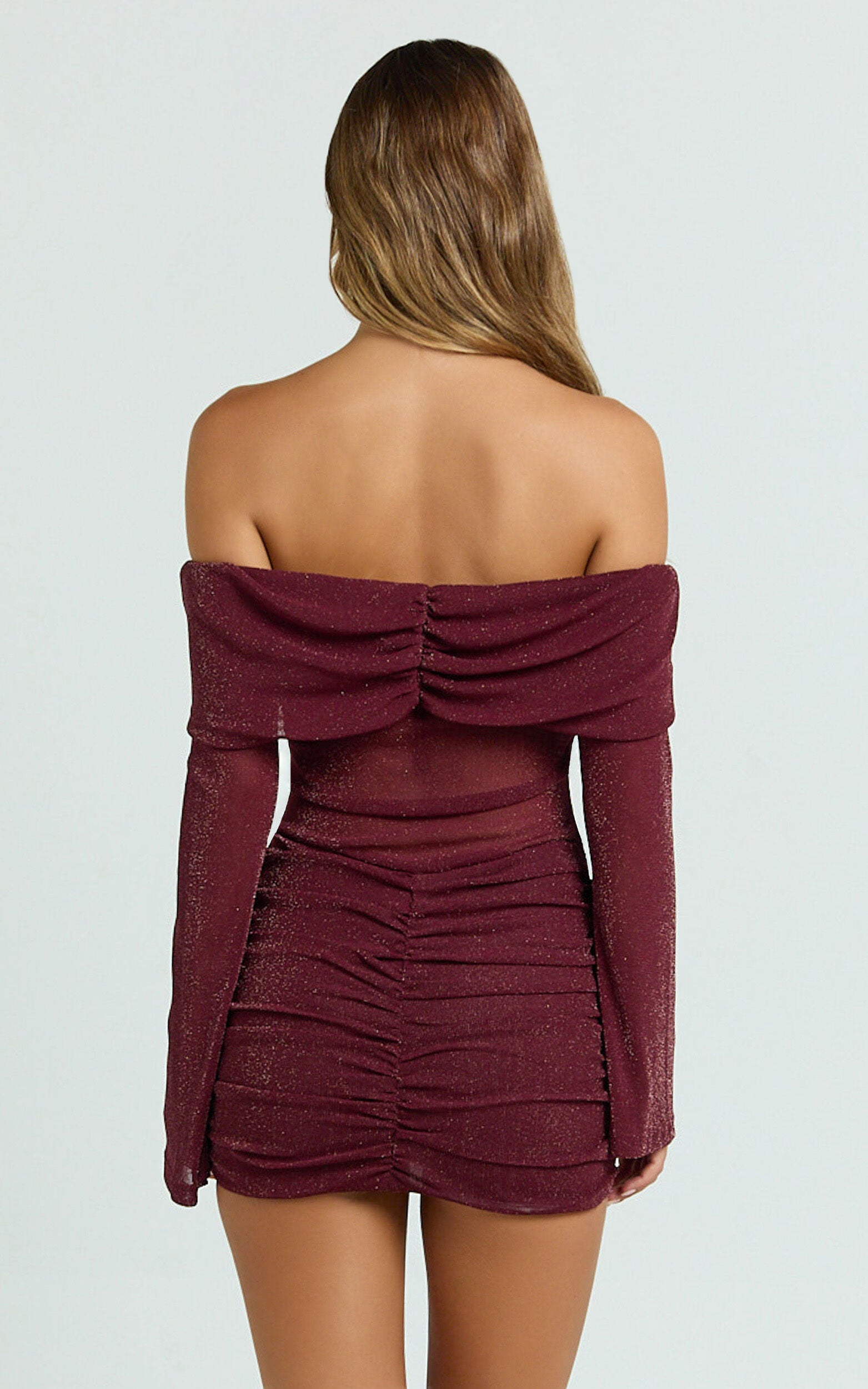 Make every party night unforgettable in the Rumi Mini Dress! This flirty off-the-shoulder bodycon dazzles in wine-hued glitter tulle, perfect for stealing the spotlight. With its romantic ruched detailing and figure-hugging silhouette, it��s made for dancing ��til dawn or sipping champagne in serious style. The long sleeves add a touch of drama while the mini length keeps things playful. Slip into this dreamy mini dress for your next night out and get ready to turn all the heads. Add your fave heels and be the ultimate party muse!