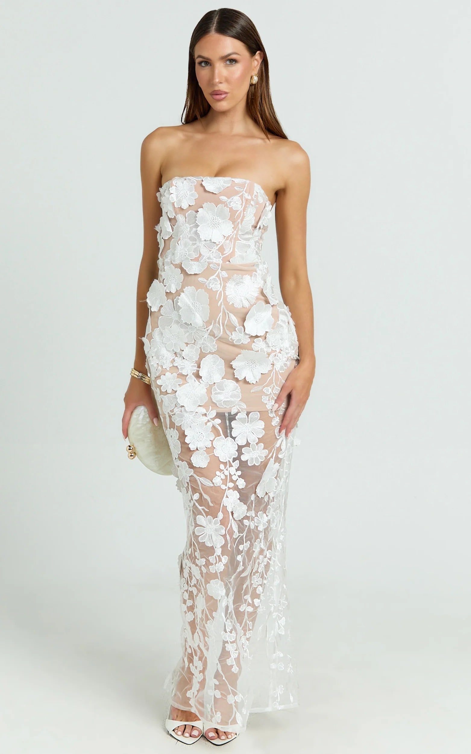 This strapless column silhouette skims and flatters, while 3D floral appliqués add a romantic bloom that feels fresh and modern. The crisp White tone keeps it ultra-chic and versatile for Dresses season, think hens, engagement parties, or white-party moments, serving Quiet Luxury with an effortless glow.