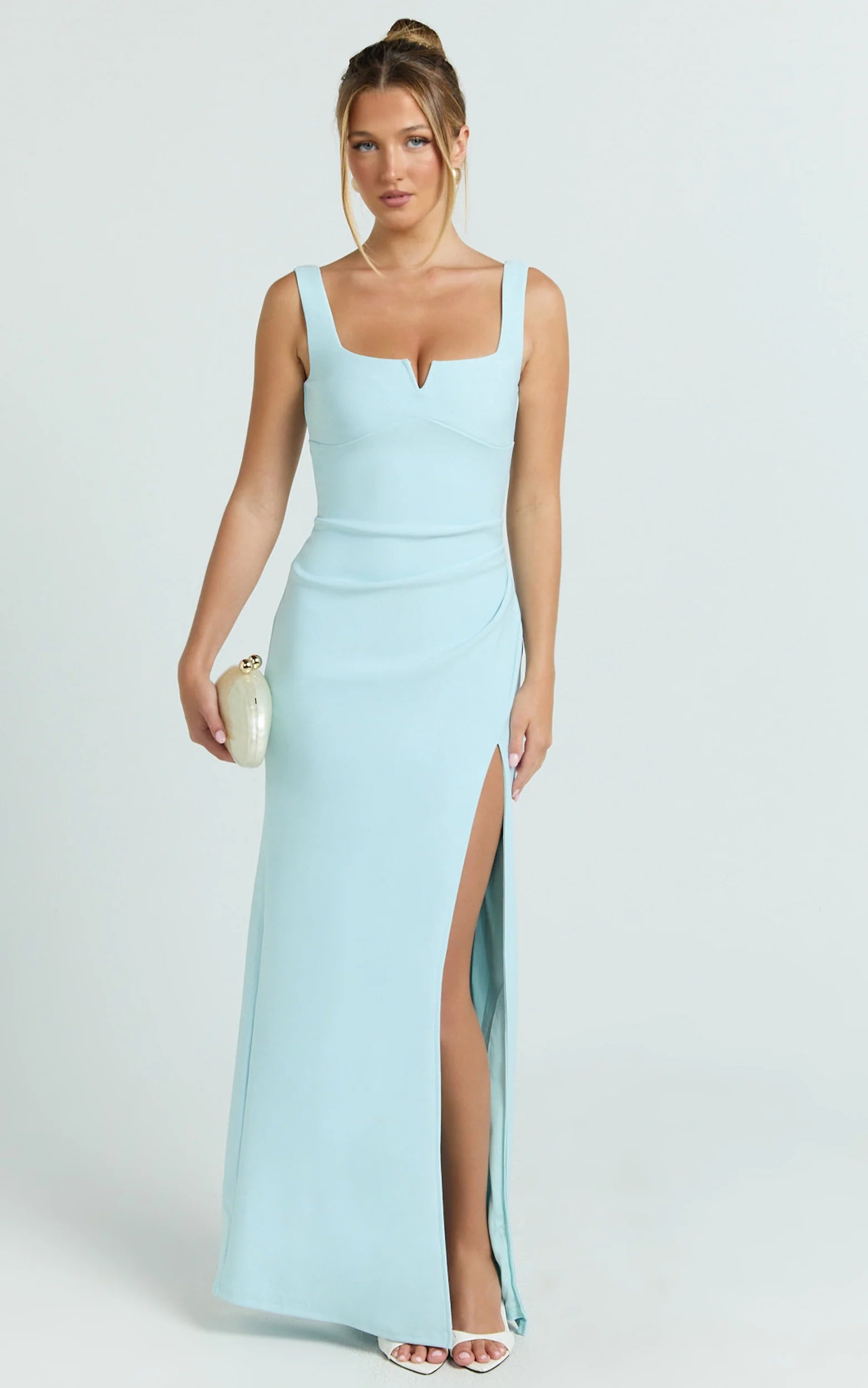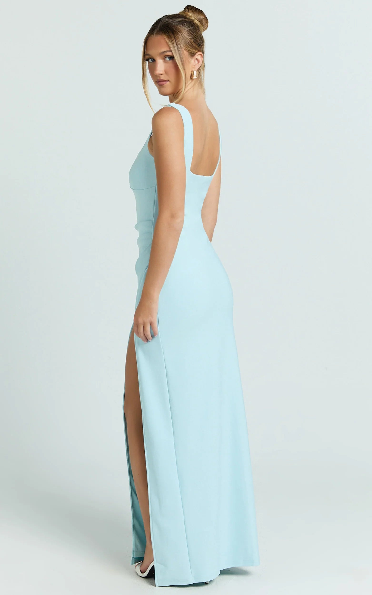 Thelma Maxi Dress - Square Neck Bodycon Dress In Light Blue slips effortlessly into your wardrobe as a versatile fave, think coastal grandmother meets street fashion with a modern twist. Dress it up with ruched bodycon dress-inspired glam or keep things pared back and refined for autumn fashion nights out. A go-to choice for Dresses lovers who want easy styling, confident curves, and endless compliments.