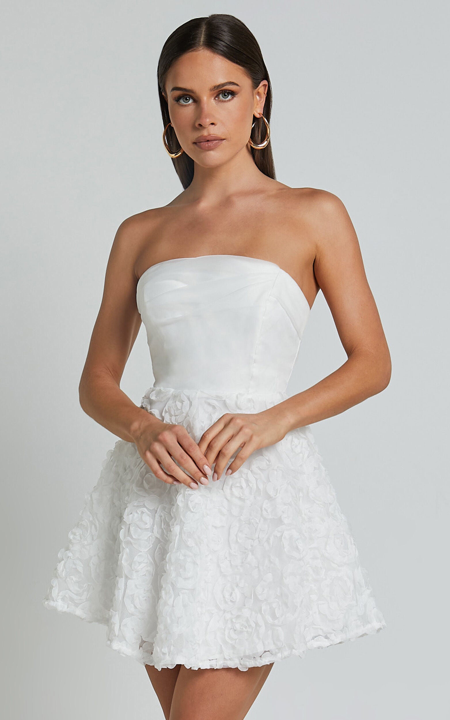Get ready to turn heads in the Violeta Mini Dress! This strapless 3D floral dress is perfect for a party night or bachelorette celebration. The A-line silhouette and embroidered details add a fun and flirty touch, while the polyester fabric ensures maximum comfort. Whether you're dancing the night away or enjoying a night out with friends, this white mini dress will make you feel like the life of the party. So go ahead, grab your favorite heels and get ready to shine in this stunning strapless number!Product Details:Zips featureInner liningA-line dressEmbroidered fabricStrapless necklineIdeal for partiesMini lengthPolyester materialSize and FitStudio model is wearing size S / 8 AU / 4 US / 8 UK / 36 EUStudio model measurements are:Height: 174cm / 5'9''Bust: 83cm / 33''Waist: 61cm / 24''Hip: 90cm / 35''Material and Care100% PolyesterLow / No stretch